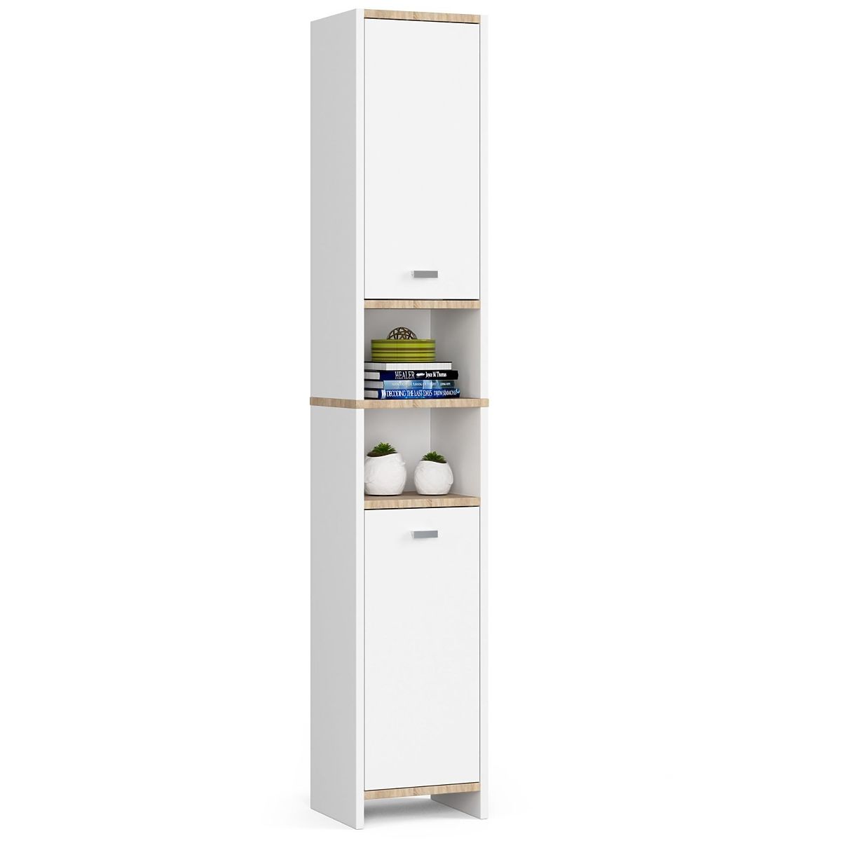 White bathroom shelf with 4 shelves and 2 doors. .. more