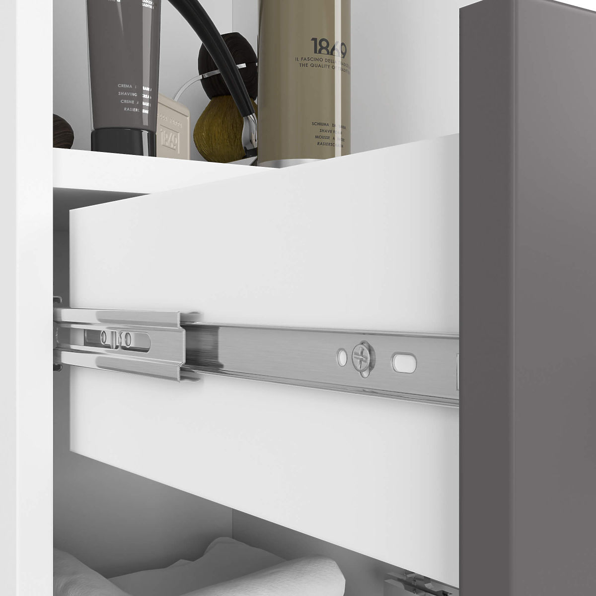 The bathroom cabinet is made from high-quality 16 mm thick laminated board. To protect your column from any impacts, its edges are finished with ABS edging. The bathroom column shelf is available in a fashionable white/graphite gray color. The cabinet door handles are in a universal silver color. It is worth mentioning that assembling this cabinet is very simple, and the instructions are included in the package.