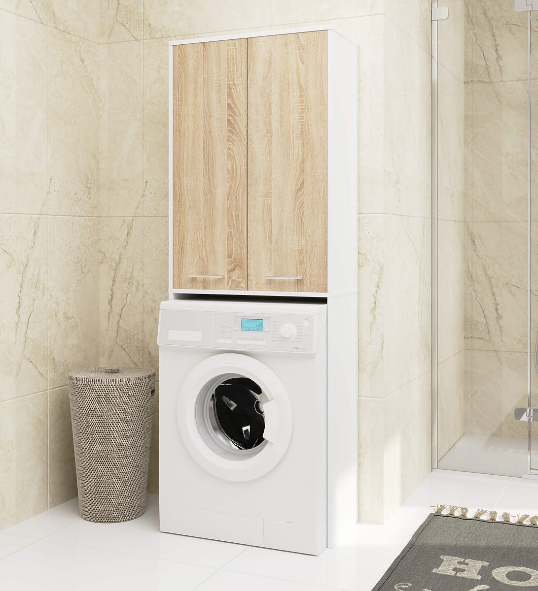 If we want our bathroom to be both comfortable and stylish, we should focus on solid and functional furniture. Such is certainly the cabinet above the washing machine. It is an ideal way to utilize the space above the washing machine, which usually remains unused. The optimal dimensions of this column make it a great solution for bathrooms with limited space. Its ergonomic shape allows it to be used in any room. This furniture, consisting of an extension above the washing machine and a cabinet above it, creates a large amount of storage space for various items. We can store products like detergents or hygiene products in the cabinet. These shelves are intended for storing personal cosmetics or towels. The beautiful shade of white with Sonoma oak fronts guarantees us an elegant bathroom appearance. The laminated board from which this cabinet is made is a high-quality material. It ensures the durability and strength of the furniture, as well as maintaining its aesthetic appearance.