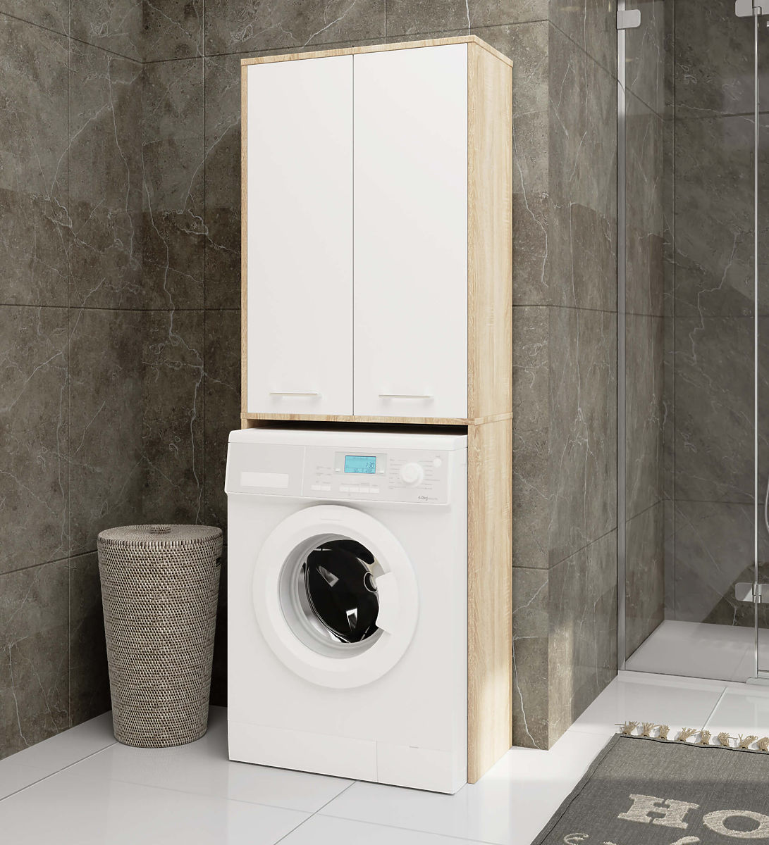 If we want our bathroom to be both comfortable and stylish, we should focus on solid and functional furniture. Such is definitely the cabinet above the washing machine. It is an ideal way to utilize the space above the washing machine, which usually remains unused. The optimal dimensions of this column make it a great solution for bathrooms with limited space. Its ergonomic shape allows it to be used in any room. This furniture, consisting of an extension above the washing machine and a cabinet above it, creates a large amount of storage space for various items. We can store detergents or hygiene products in the cabinet. These shelves are designed for storing personal cosmetics or towels. The beautiful shade of oak sonoma with white fronts guarantees an elegant appearance for the bathroom. The laminated board from which this cabinet is made is a high-quality material. It ensures the durability and strength of the furniture, as well as maintaining its aesthetic appearance.