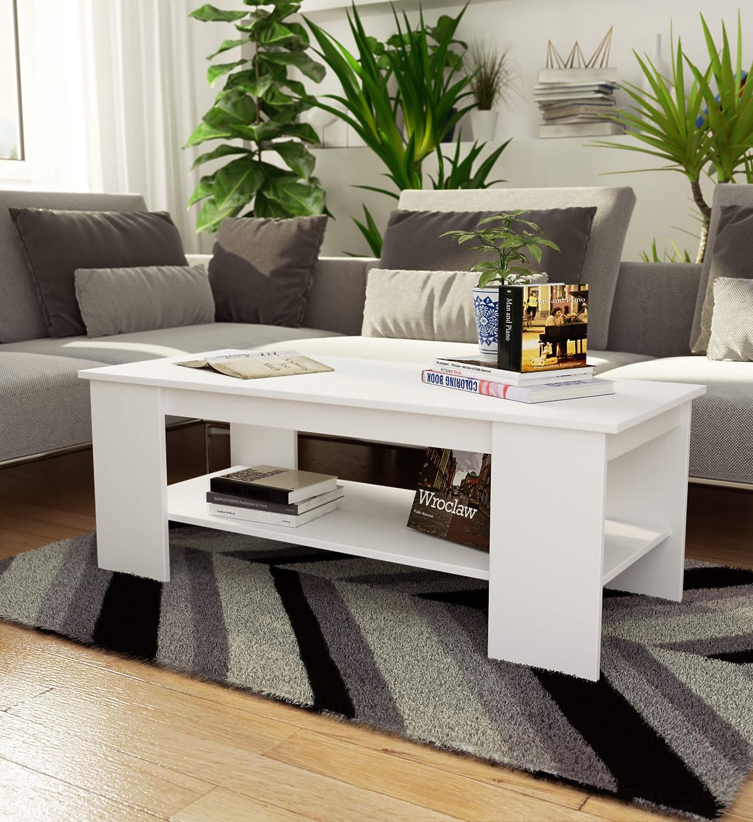 The white Kami coffee table combines an attractive and aesthetic appearance with functionality and versatility. Thanks to its warm white color, the table fits perfectly into both modern and traditional interiors, while visually enlarging and brightening the room. The small size of the furniture ensures that the table serves its purpose even in a small apartment room. The table is a piece of furniture with versatile use. It can be used not only for drinking coffee, tea, or cold drinks, hosting guests, or everyday relaxation. The table with a functional top is also suitable for working with a laptop, while the wide shelf placed below allows for the placement of computer accessories and work materials. The white Kami coffee table is made from abrasion and water-resistant laminated board, allowing the furniture top to be successfully cleaned even with a wet method. The table edges are finished with durable ABS edges, further enhancing the furniture's resistance to damage.