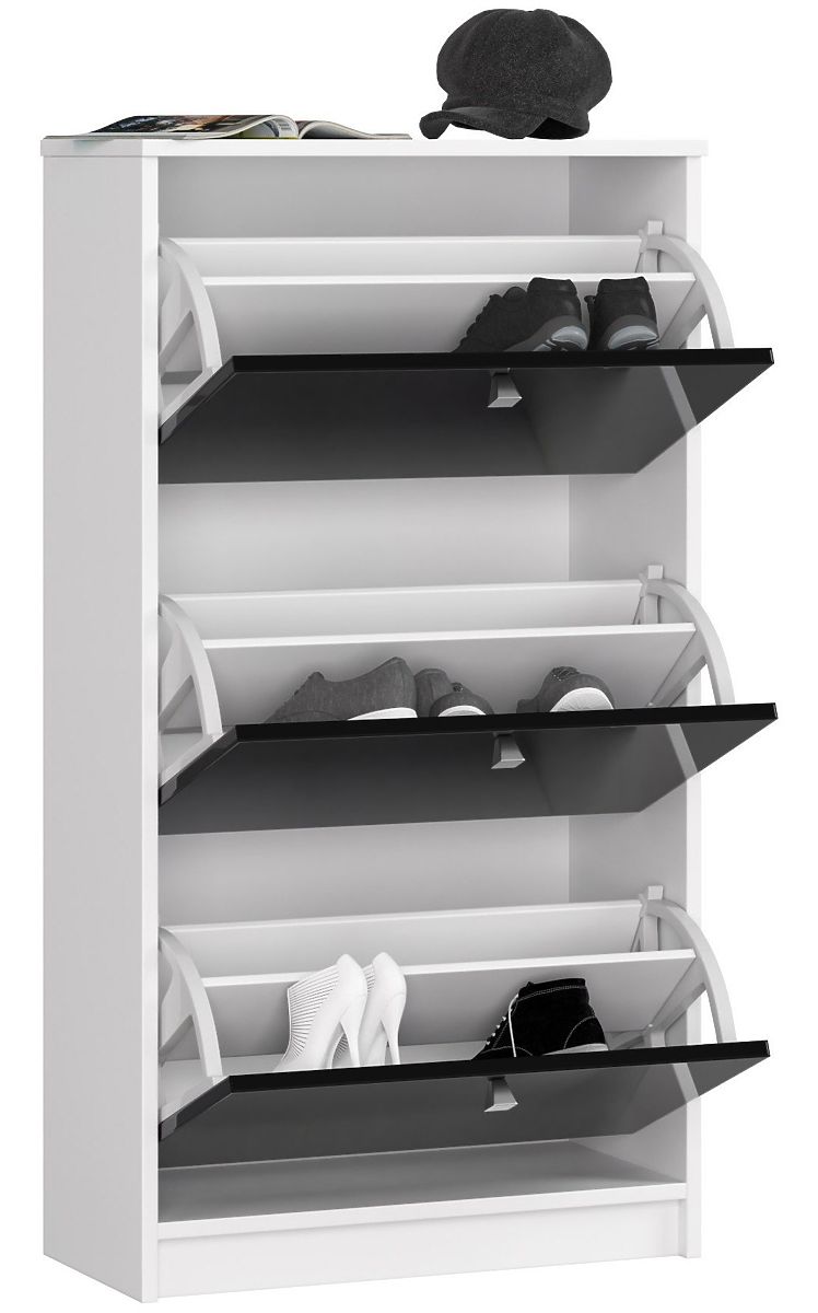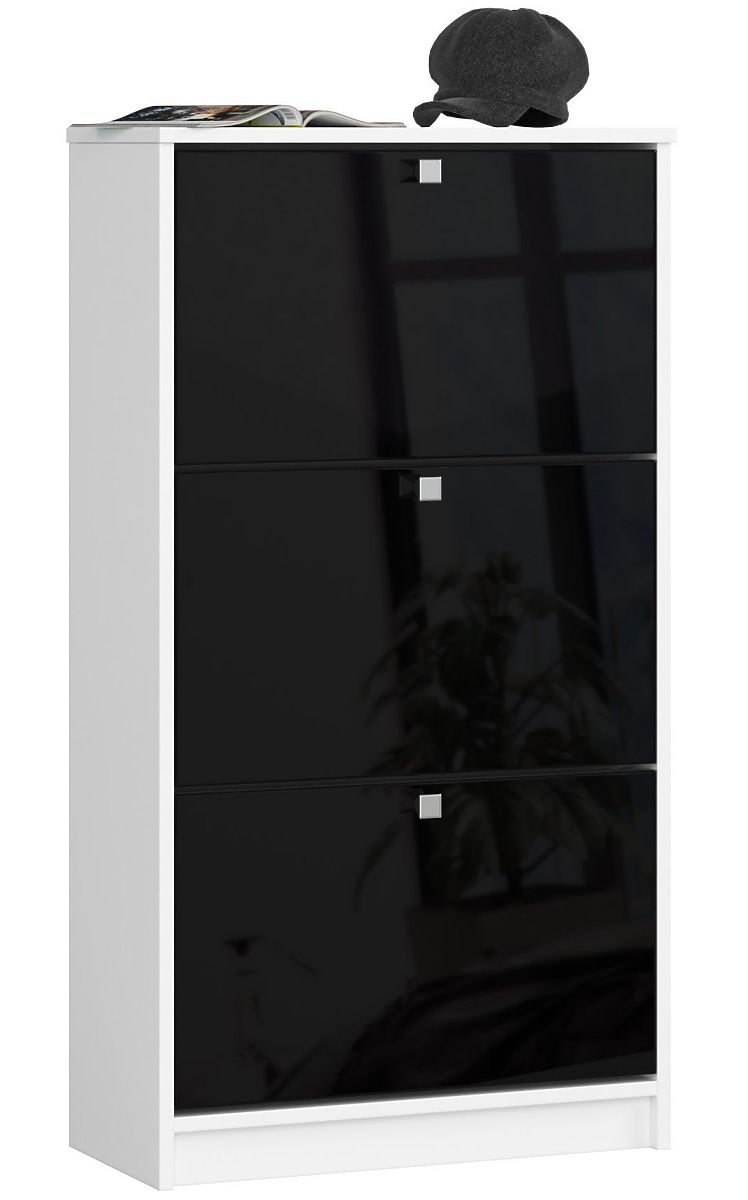 In our online store's assortment, customers have the opportunity to find many diverse shoe cabinets that fit well in hallways - regardless of their size and arrangement style. The presented shoe cabinet is an interesting offer combining quality and design at a high level. The furniture easily accommodates all pairs of shoes, which do not need to be visible and take up space, especially in small hallways. The shoe cabinet is easy to clean, charms with its modern appearance and easy maintenance. It combines two of the most popular colors - white and black. These are timeless colors that never go out of fashion. The shoe cabinet outwardly resembles a chest of drawers but consists of three flip drawers that open easily. The fronts of the shoe cabinet are made from 19 mm Acrylic MDF board with the highest gloss standard. The edges are lined with ABS edging ensuring exceptional resistance to damage. The price of the furniture also deserves attention.