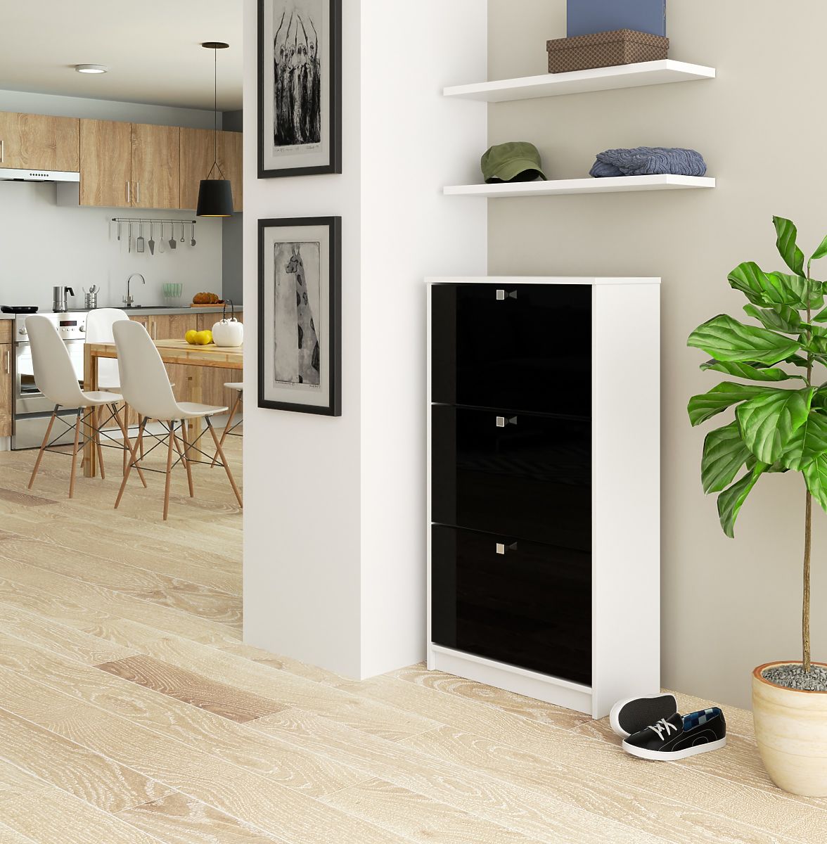 Shoe cabinet with 3 flip doors, combining white and black gloss. .. more