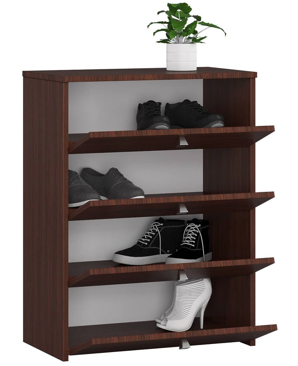 The shoe cabinet in ruby wenge color features four spacious shelves with flip doors and satin-finish handles. This small piece of furniture fits any type of hallway, regardless of its size and style. The shoe cabinet in ruby wenge color will beautifully contrast with light-colored hallway walls. Thanks to its subdued color and meticulous craftsmanship, the furniture looks elegant and fits both classic and modern arrangements. The shoe cabinet is a practical and proven solution as it helps maintain order in the hallway, enhancing the comfort of using this space. The shelves designed for shoes can store both outdoor and indoor footwear, brushes, and shoe polishes, preventing an unsightly clutter of shoes on the floor. The shoe cabinet is made from abrasion-resistant laminated board, with edges finished with durable ABS edging.