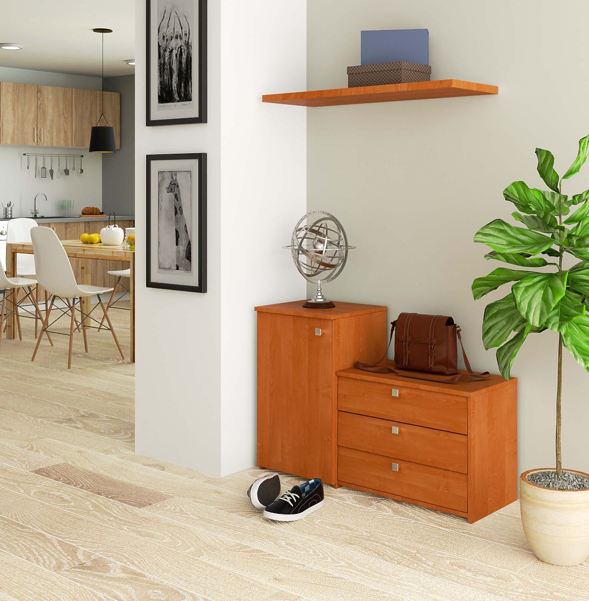The shoe cabinet combined with a dresser ensures functionality and space-saving.