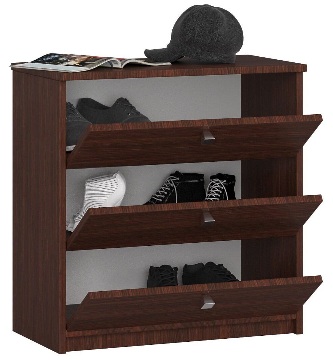 Compact wenge shoe cabinet with 3 flip doors and 3 shelves. .. more
