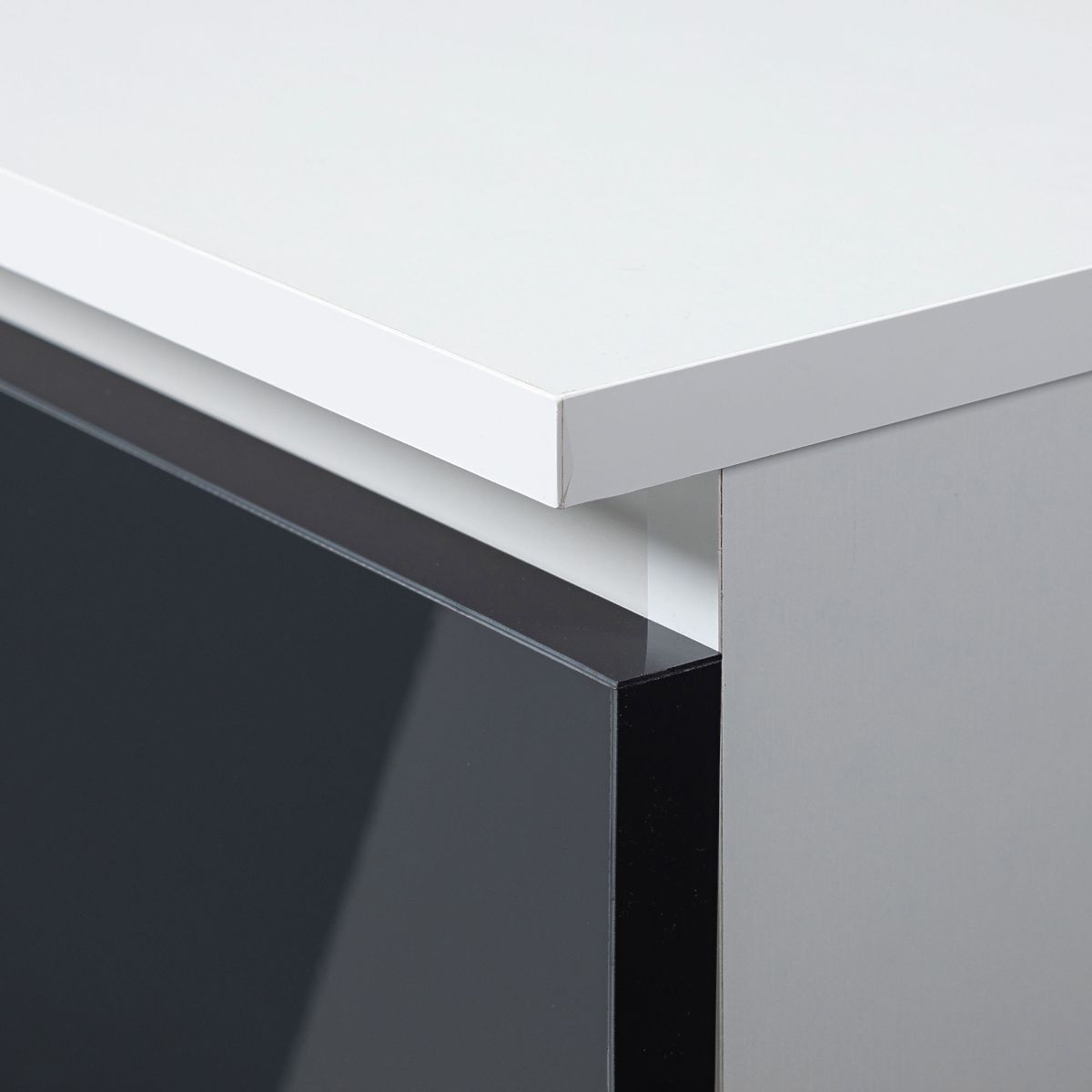 The body of the sideboard is made from 16 mm laminated board in white semi-matte color, the fronts are made from acrylic board in GRAPHITE 19 mm high gloss.