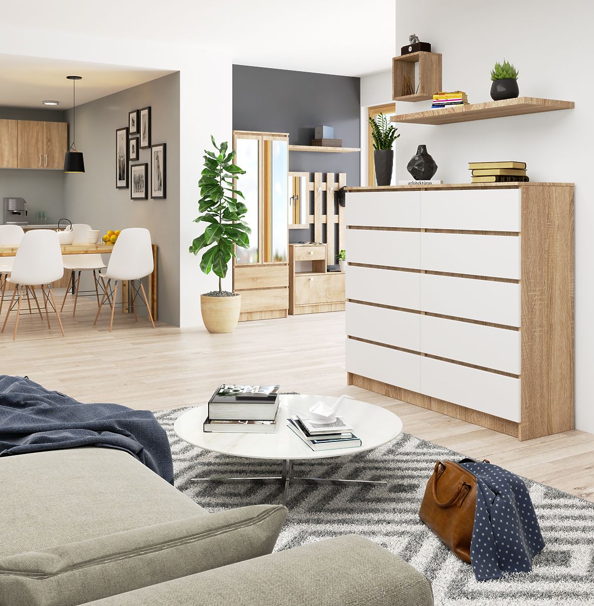 Sonoma oak has recently become one of the most popular furniture colors. It has gained customer recognition due to its exceptionally versatile nature. Additionally, furniture in Sonoma oak color is very easy to clean, which is also its undeniable advantage. The second, equally popular color is timeless white. The furniture we offer is a delicate combination of these two colors, which has resulted in an excellent effect.