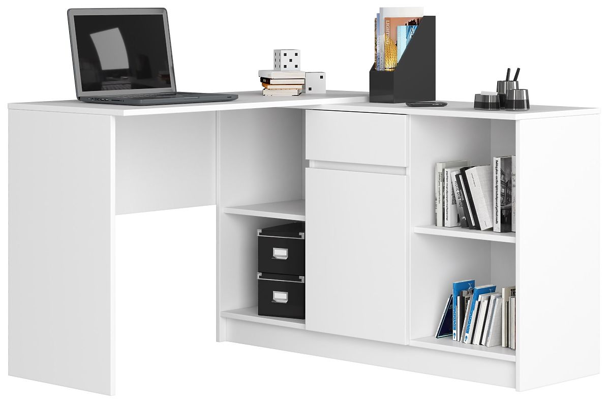 The white sideboard from the B-17 set can serve as an independent element of any room's furnishings. Thanks to its modular design, it can be combined with another segment of the set to create a comfortable corner desk (additional table elements available for purchase in our store). The middle section of the sideboard includes one drawer and a closable door, allowing for free storage. Additionally, it has four separate, symmetrical shelves with plenty of display space. The sideboard, 120 cm in length and 77 cm in height, is made of laminated board. It has been designed to fit most rooms. It can be an interesting element of a living room interior, serve as functional storage furniture in a bedroom, and is also suitable as an additional kitchen segment. Thanks to its neutral white color and minimalist design, it becomes an attractive and above all functional addition to any interior.
