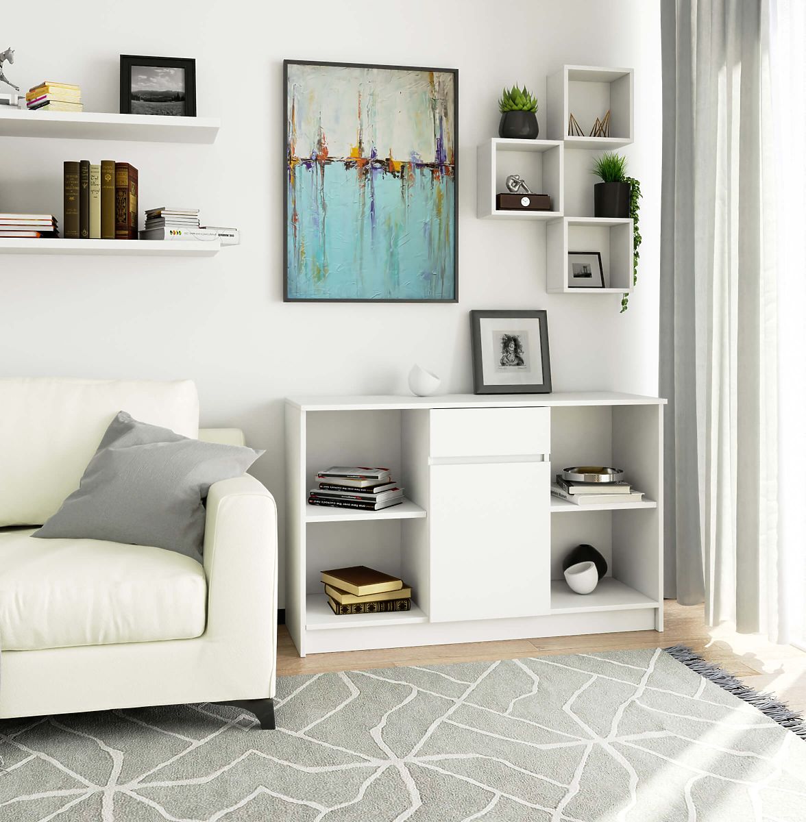 White sideboard with modular design and ample storage space. .. more