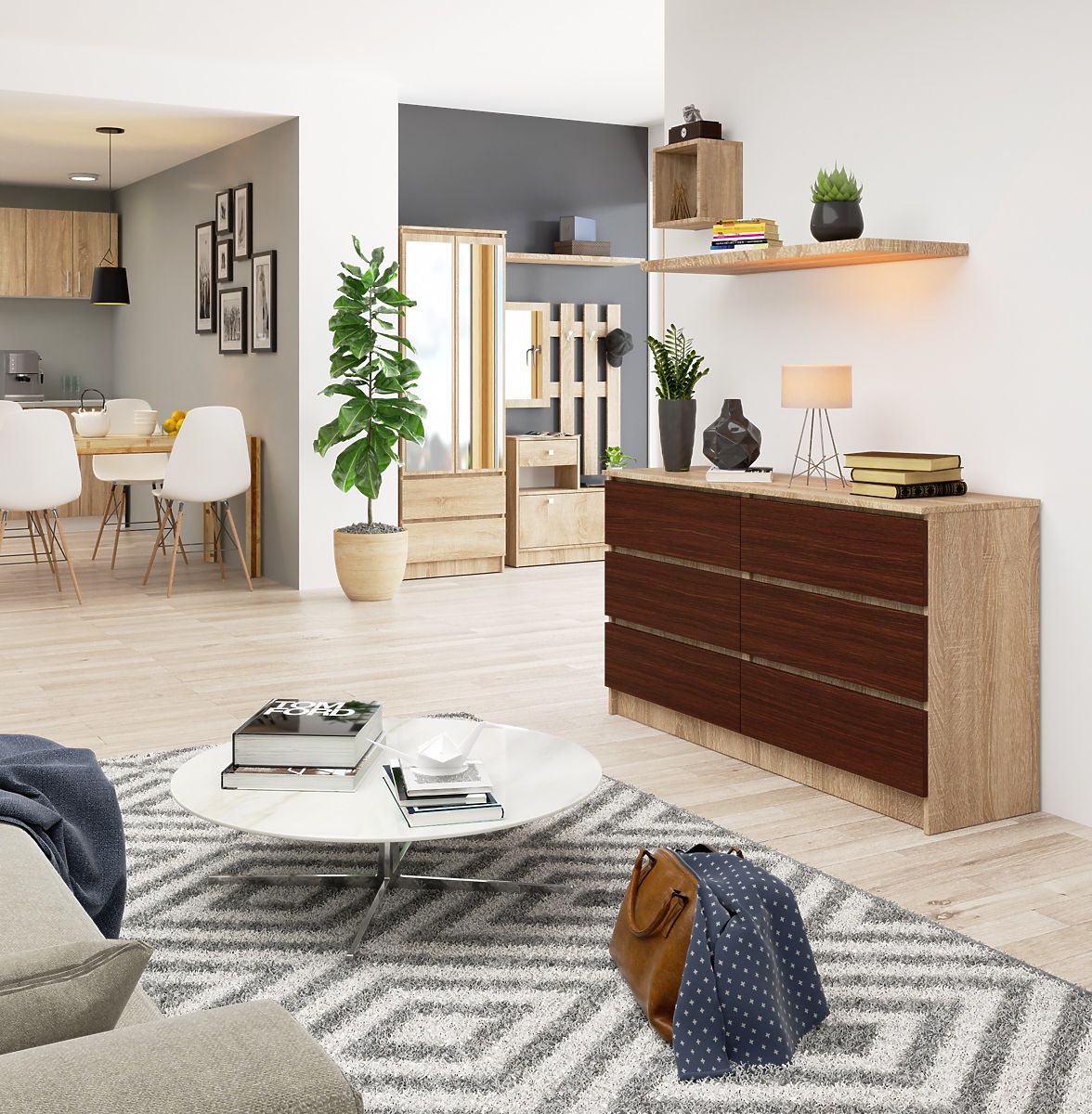 The wide sideboard is a combination of two classically beautiful wood shades, wenge and sonoma. These colors have been very popular in recent years and it's no wonder they are in high demand among customers of our online store. If you are looking for a functional and quality sideboard - you are in the right place. The furniture consists of six drawers made from durable laminated board - a material resistant to abrasion and damage.