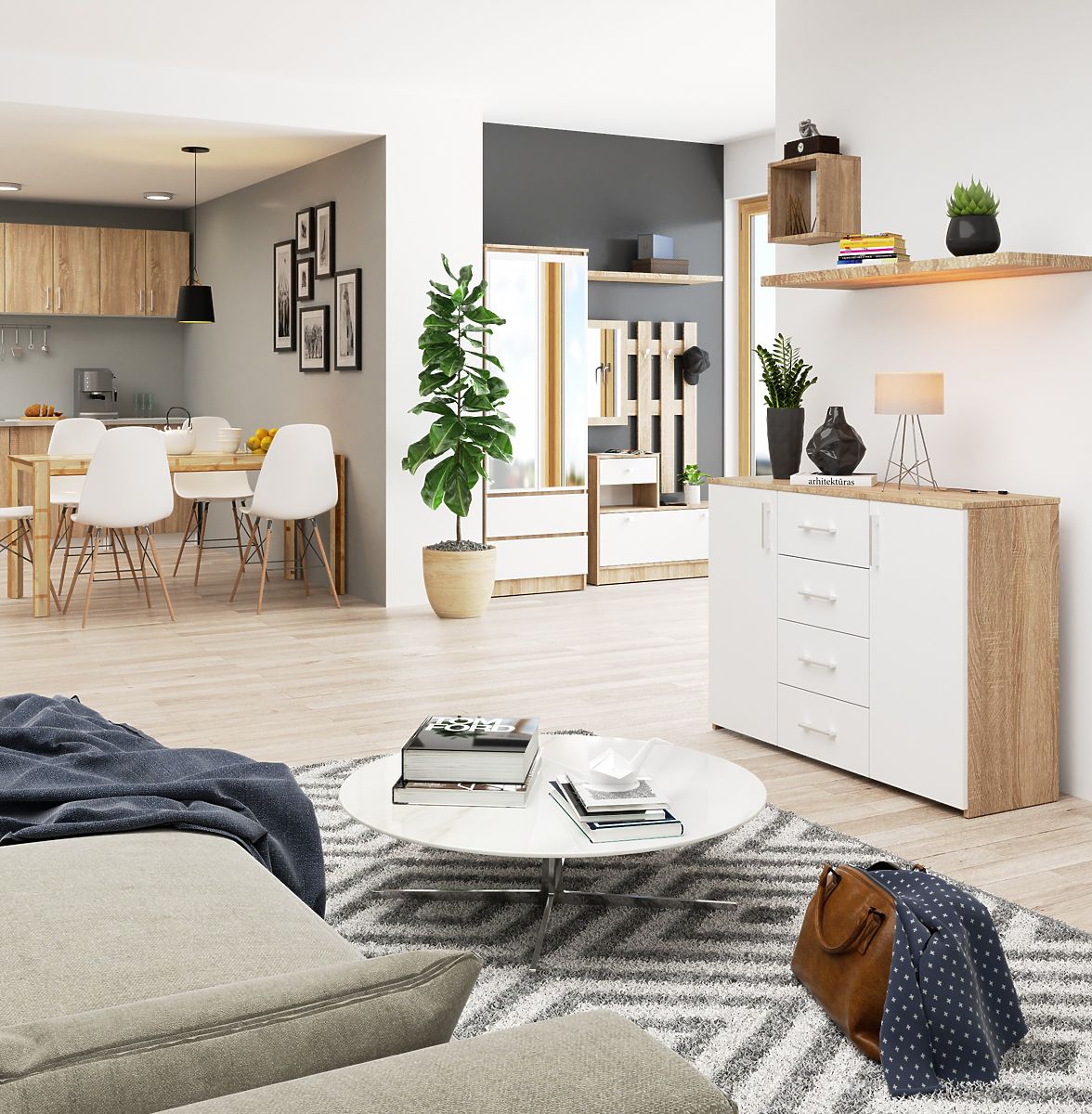 The chest of drawers, model K 45, is an excellent response to the needs of modern users. Made in matte white with the addition of stylish artisan oak, it reflects nature and elegance. This unique solution offers users a wide range of arrangement possibilities, limited only by imagination.
