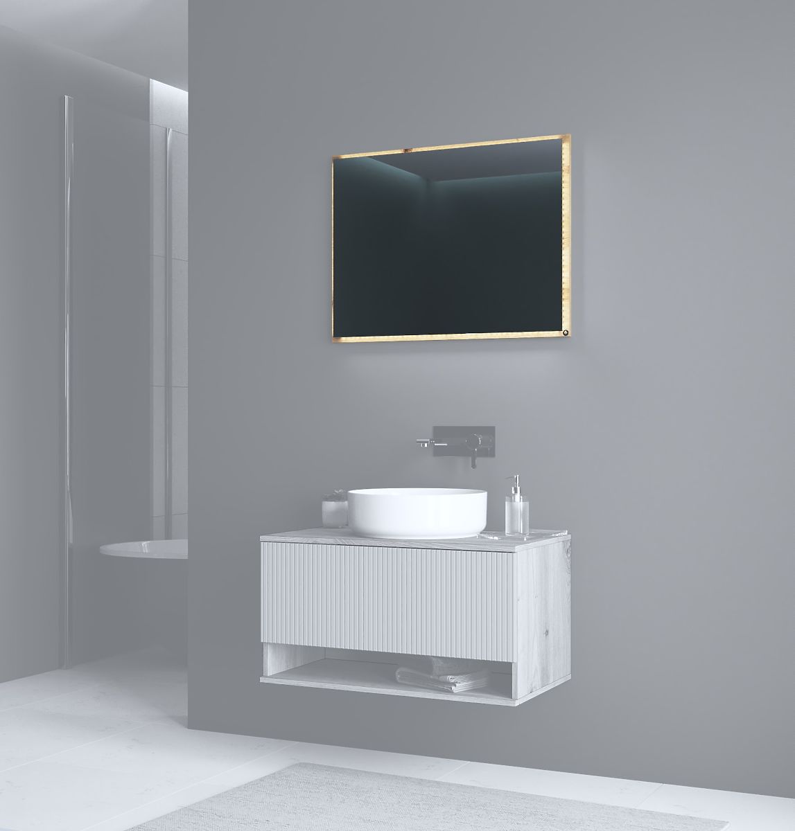 Quality materials – laminated furniture board, glass, and LED lighting – ensure long-lasting durability. The warm artisan oak decor adds a natural touch and blends well with both modern and classic interiors.