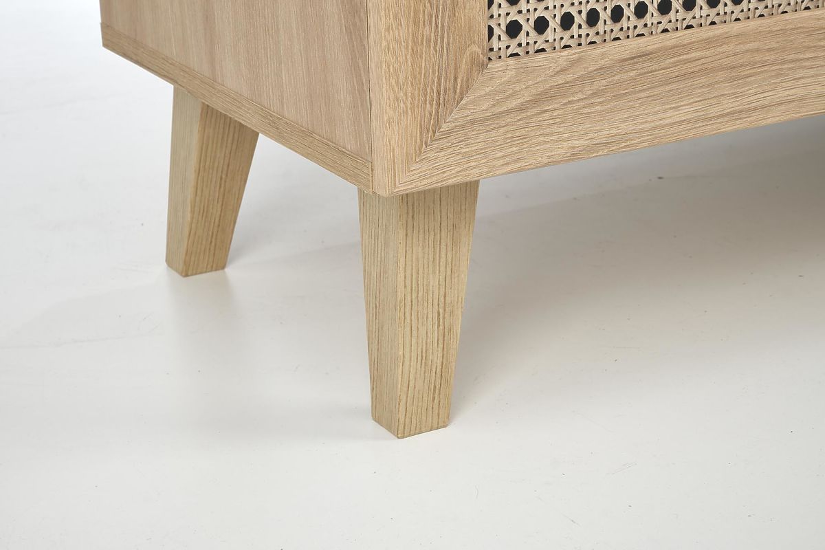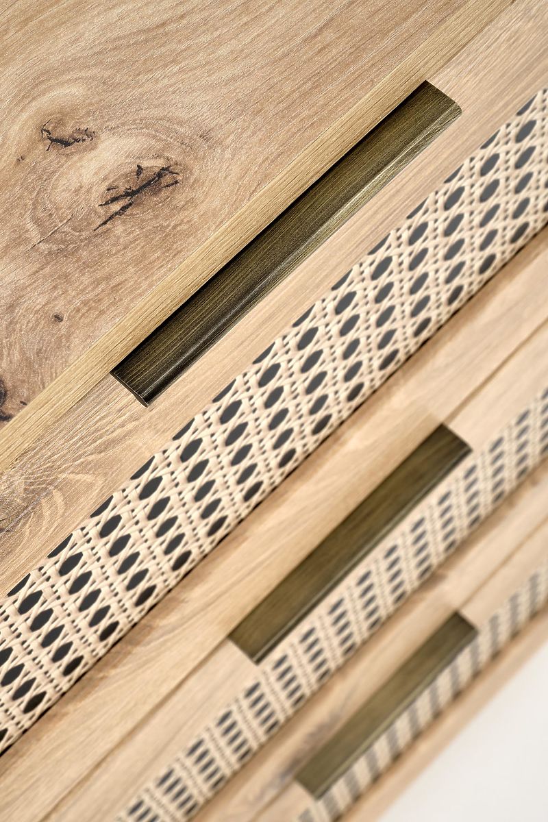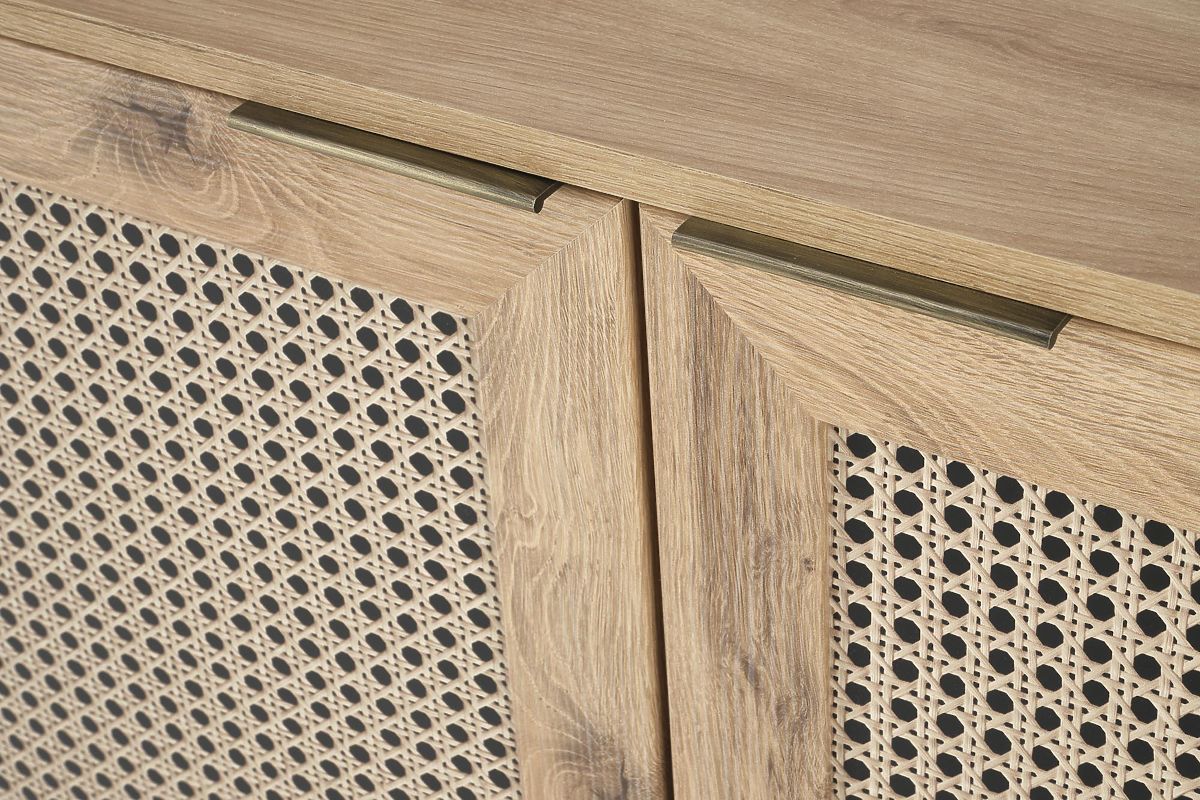 The oak artisan finish combined with trendy inserts in the Viennese braid pattern gives the sideboard a unique boho touch that immediately catches the eye.