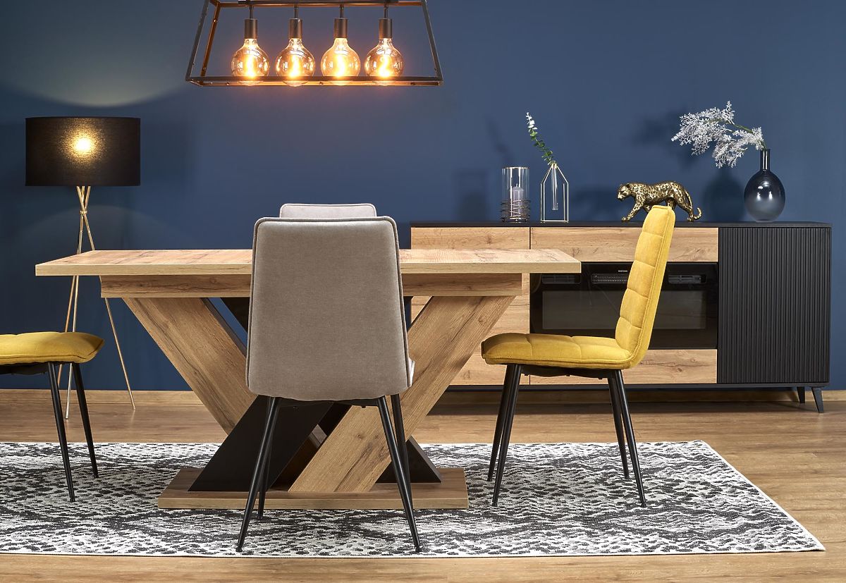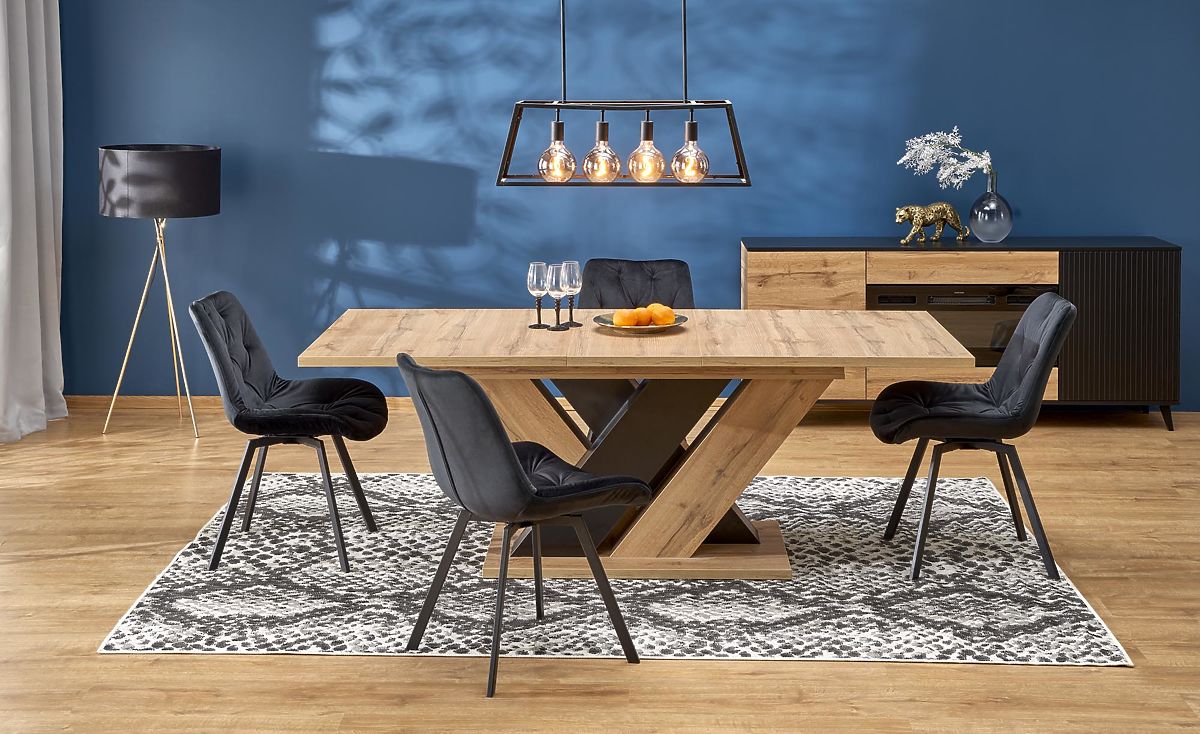 The interesting design of the legs, made from a board combining oak wotan and black decor, gives the table a unique appearance and creates a striking interior element. The X-shaped construction also ensures excellent stability and strength, so you don't have to worry about unwanted wobbling or shifting.