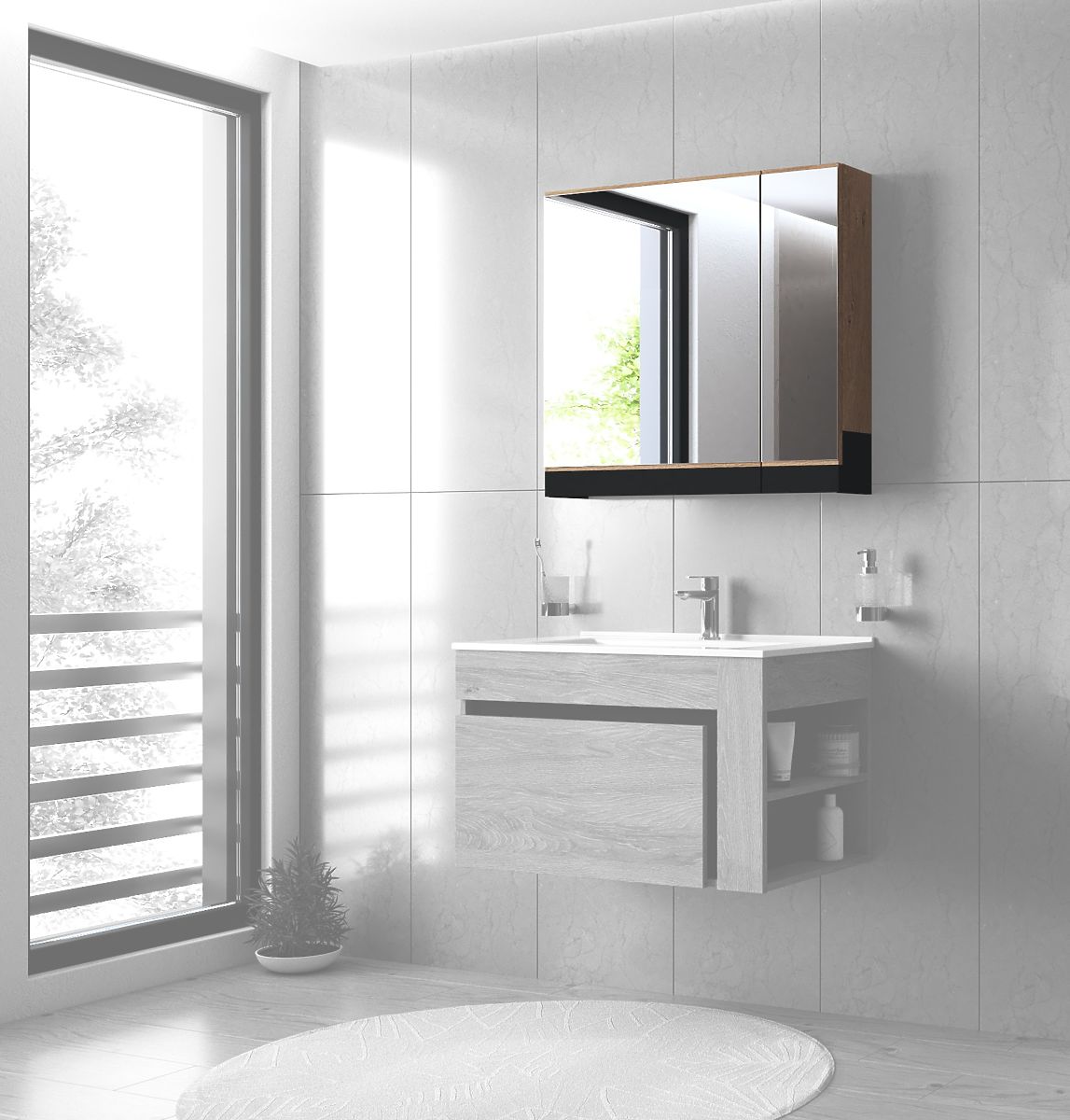 Mirror cabinet with soft close in golden oak and black. .. more