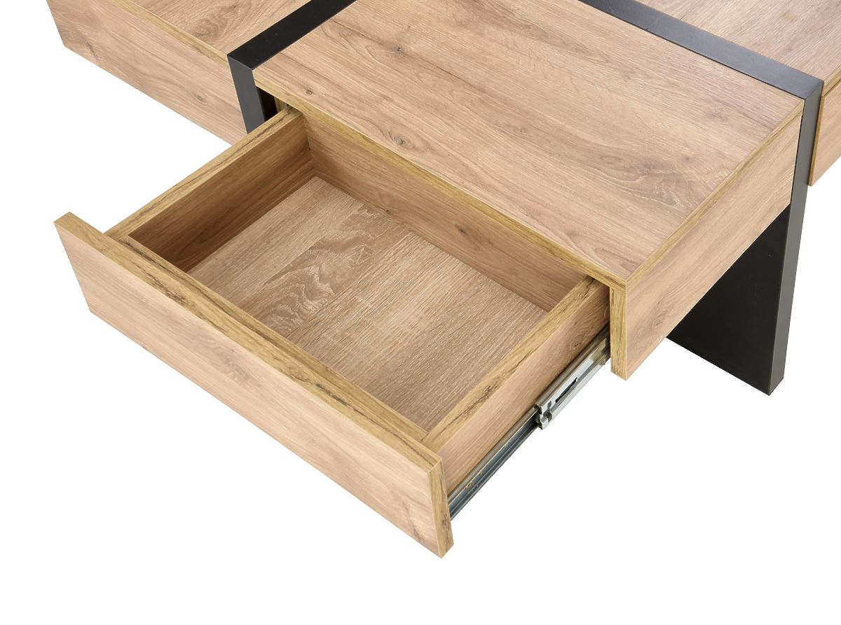 The stylish SEVILLA coffee table is a modern and functional addition that fits perfectly into any living room. Its unique design with four hidden drawers offers a surprisingly large amount of storage space without disrupting the table's clean and elegant appearance. Thanks to the smart opening system by sliding parts of the top, the table appears dynamic yet very minimalist. The SEVILLA coffee table is designed with an emphasis on practicality and aesthetics. The combination of oak craft decor and contrasting black legs creates a timeless look that easily fits into modern and industrial interiors. The robust construction and quality materials ensure long-lasting durability and comfort for everyday use.