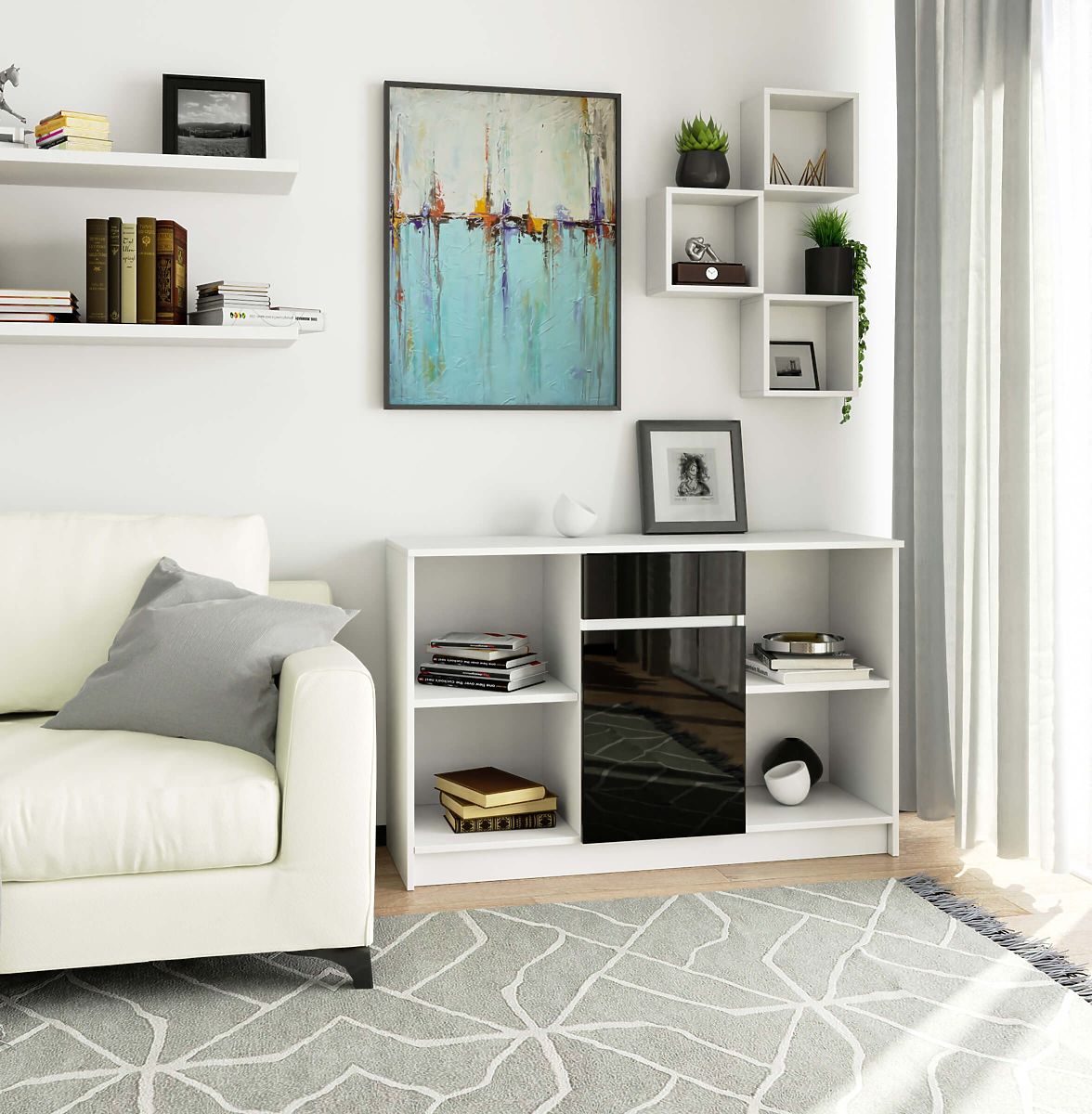 Spacious white sideboard with black gloss fronts and modular design. .. more