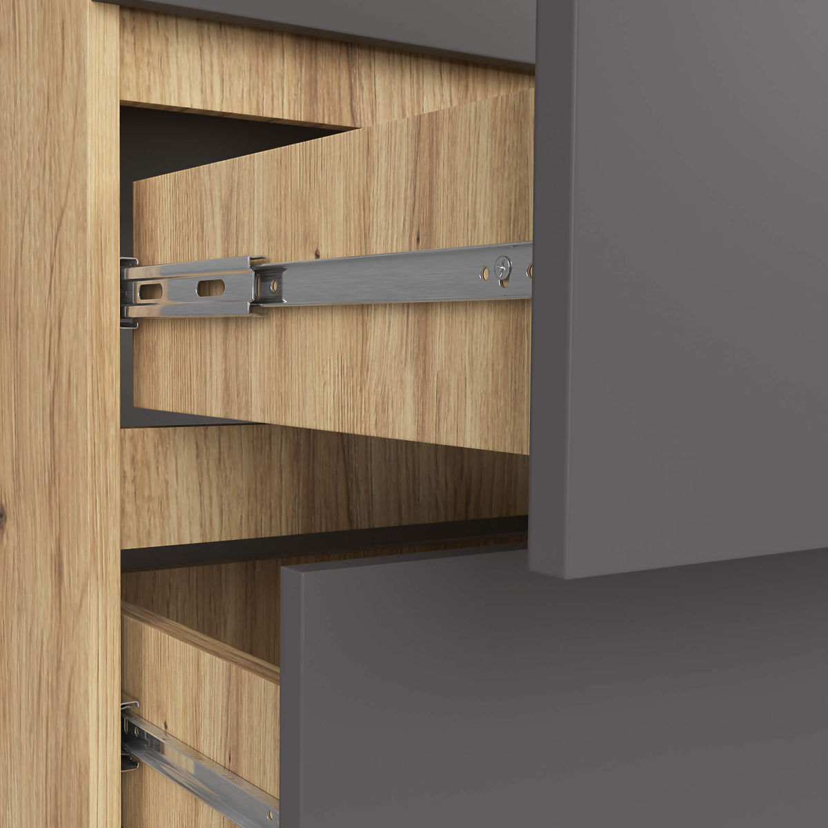 - Drawers move on metal roller guides- Edges finished with ABS edging providing high protection against damage