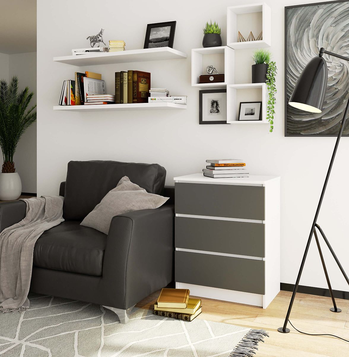 Three-drawer white and gray chest made from durable laminated board. .. more