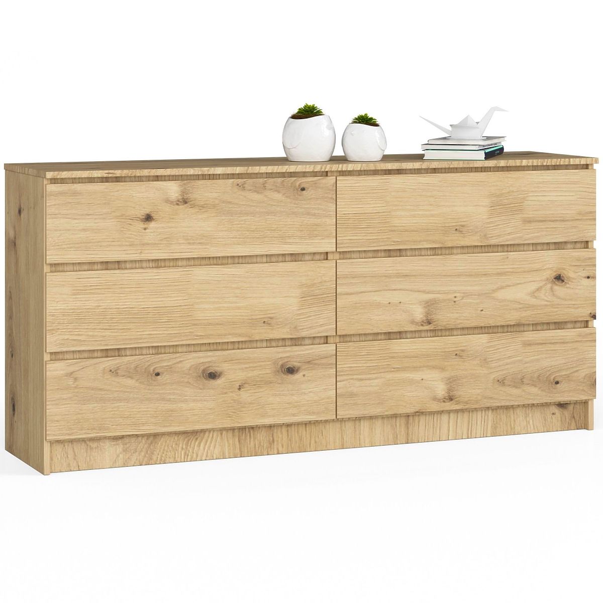 The modern sideboard K 160 cm is a product that combines high aesthetic processing and functionality. The furniture consists of six spacious drawers, making it suitable for use in the living room, children's room, office, dining room, as well as many other rooms where it allows storage of many items. The sideboard in an interesting color (oak artisan) fits very well into interiors designed in industrial, modern, Scandinavian, or loft styles, and will also appeal to lovers of retro atmosphere. It is an interesting offer to which you can match other sideboards, wardrobes, shelves, and desks designed in the same style. The minimalist form combined with high quality will surely appeal to many customers.