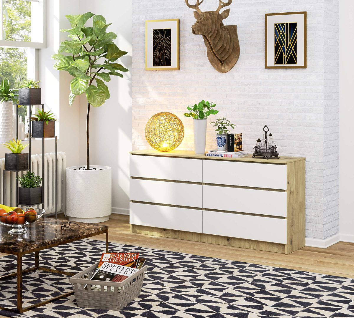 The K 160 cm chest of drawers for the living room is furniture equipped with six spacious drawers. The combination of artisan oak with timeless white has resulted in furniture that perfectly fits into many diverse interiors. It can be used in the bedroom, living room, student room, and office. The chest of drawers will match rooms furnished in minimalist, modern, Scandinavian, retro, and loft styles. It is a perfect combination of simplicity and elegance, appreciated even by the most demanding.