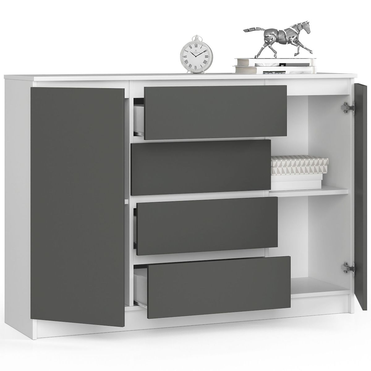 Sideboard with 2 doors and 4 drawers in white and graphite gray. .. more