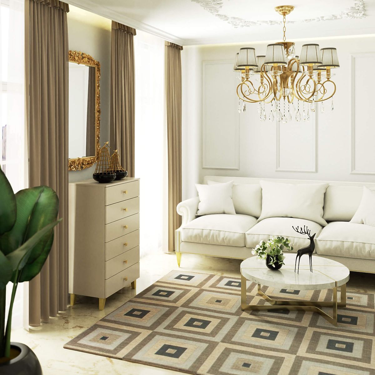 This small chest of drawers is a piece of furniture that will find use in any room. Modern colors, solid construction, and careful craftsmanship have led to the creation of a cabinet that will prove useful in the hallway, living room, student room, and even the bedroom. It can also be used in an office space, allowing for the storage of many documents and other office supplies. The chest consists of 6 drawers. The furniture combines cashmere and gold colors.