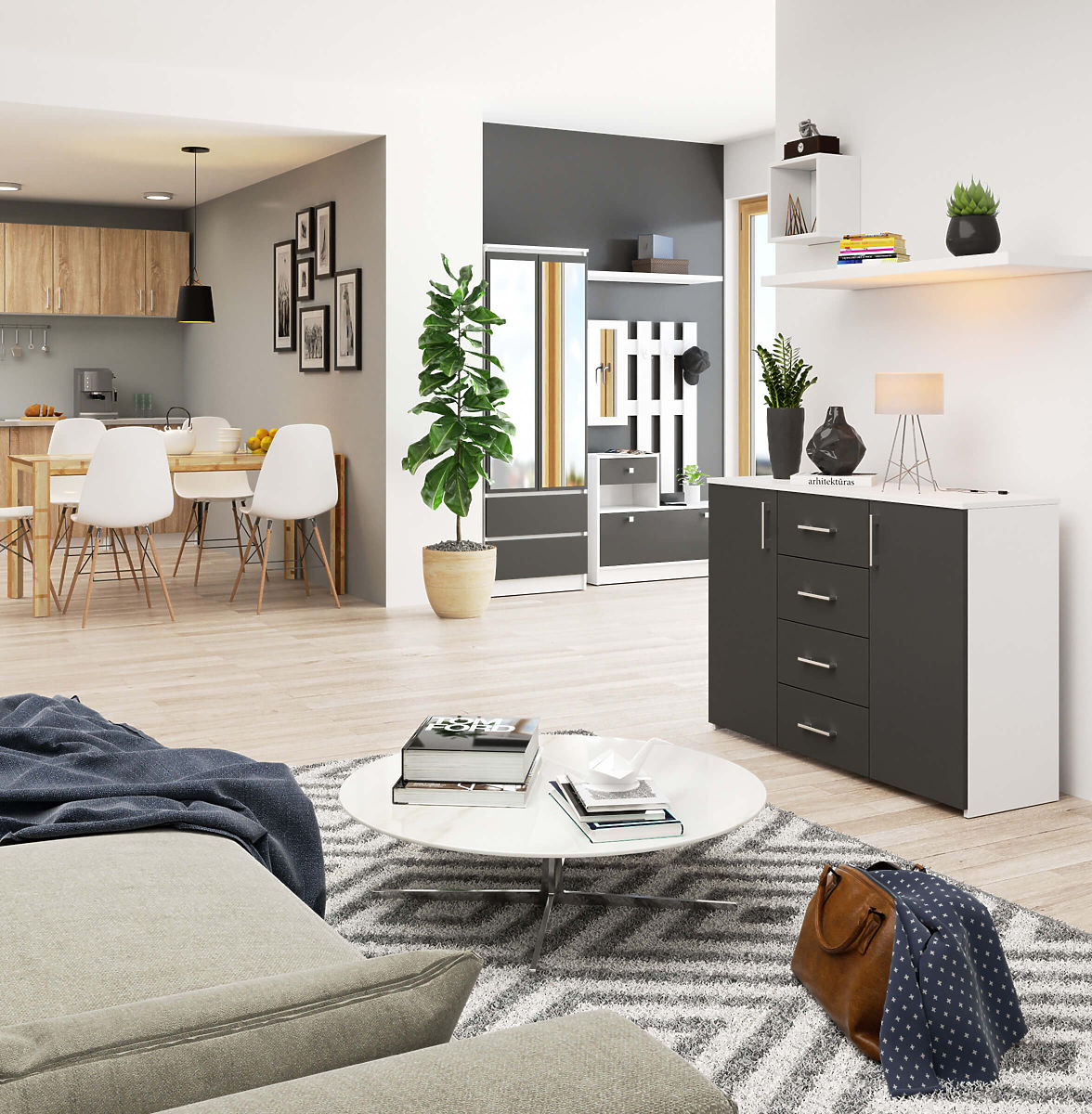 The white / graphite gray chest of drawers is a large and spacious piece of furniture with many functional features. On both sides of the chest are doors, behind which are 4 deep shelves. The center of the furniture is also very functionally designed, as it is equipped with 4 deep drawers. Therefore, the chest offers plenty of storage space.