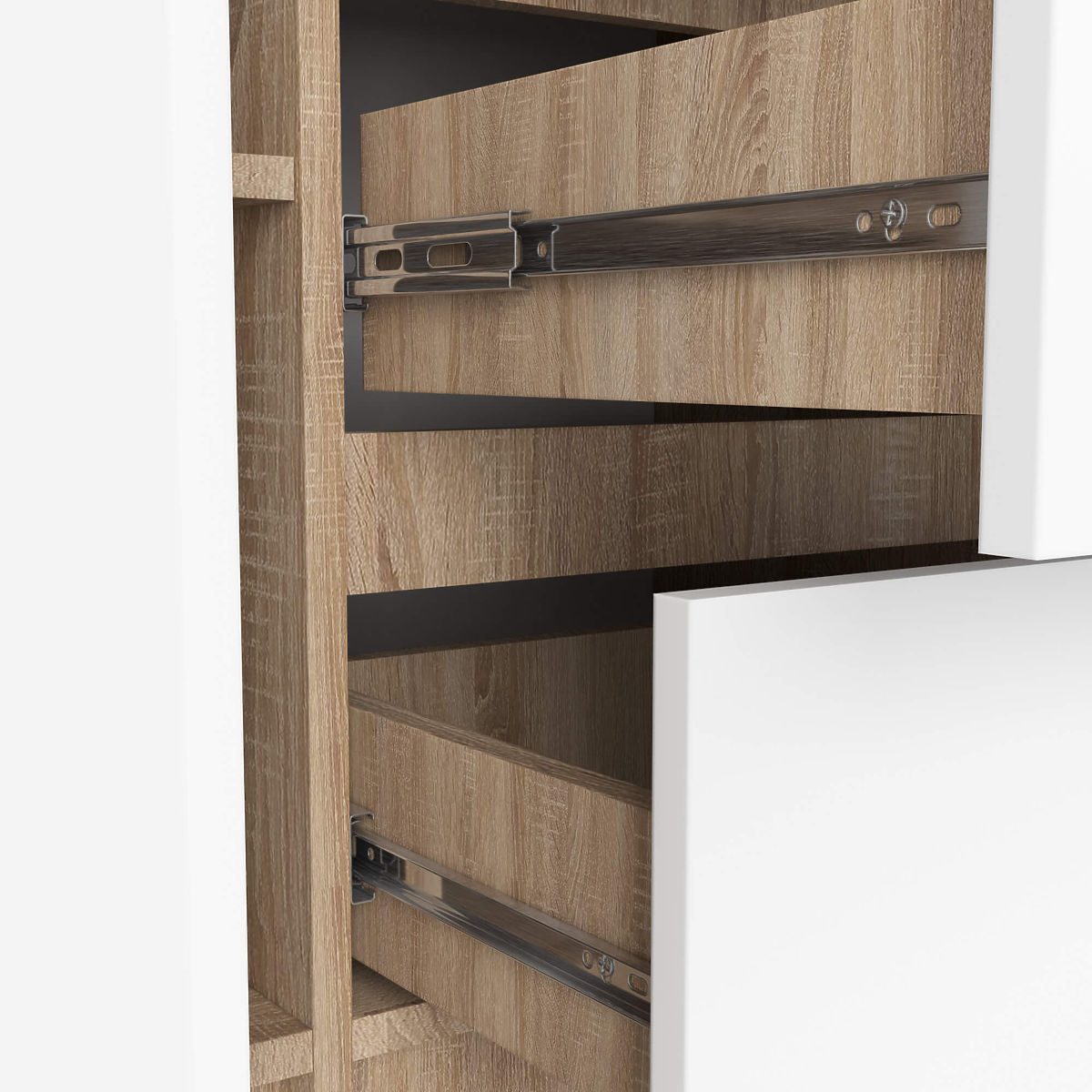 - Drawers move on metal ball runners