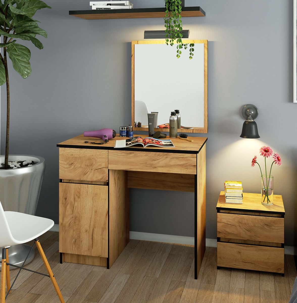 Dressing table with mirror in oak craft color with drawers and spacious storage behind the door. Left-side configuration.