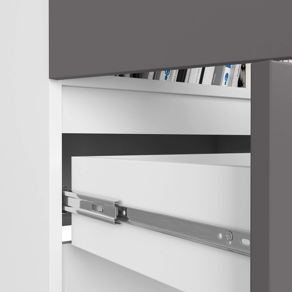 The CLP 1 office shelf features a spacious cabinet with a height of 180 cm and a width of 60 cm. The furniture has flip doors, behind which are 4 spacious shelves. These can be configured freely, as they have 3 mounting holes. An additional enhancement is a spacious drawer that moves on modern, practical ball guides. The drawer has a pull-out lock. The fronts of the furniture are made in an elegant graphite gray color, while the body is white.
