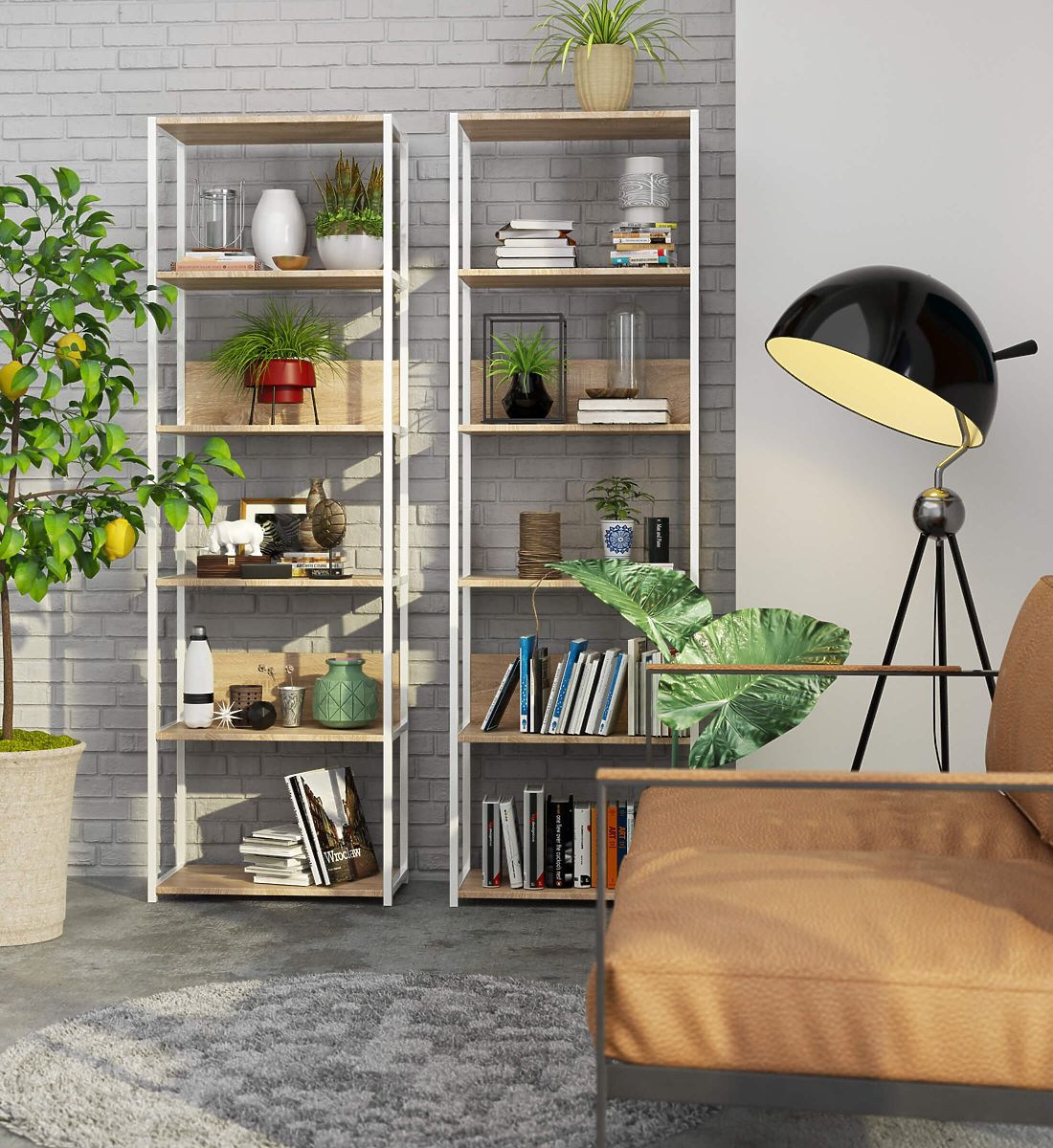 The metal loft shelf is a practical and modern piece of furniture suitable for both the living room and the office. The shelf features a white metal frame and 6 shelves in sonoma oak color. The shelves are made from 16 mm thick laminated board, a durable and sturdy material known for its high abrasion resistance. The edges are additionally protected with ABS edge, ensuring the furniture looks good even with very intensive daily use. The shelf is equipped with 6 shelves where you can place items you want to display or have at hand. Overall, it appears very stylish and modern.