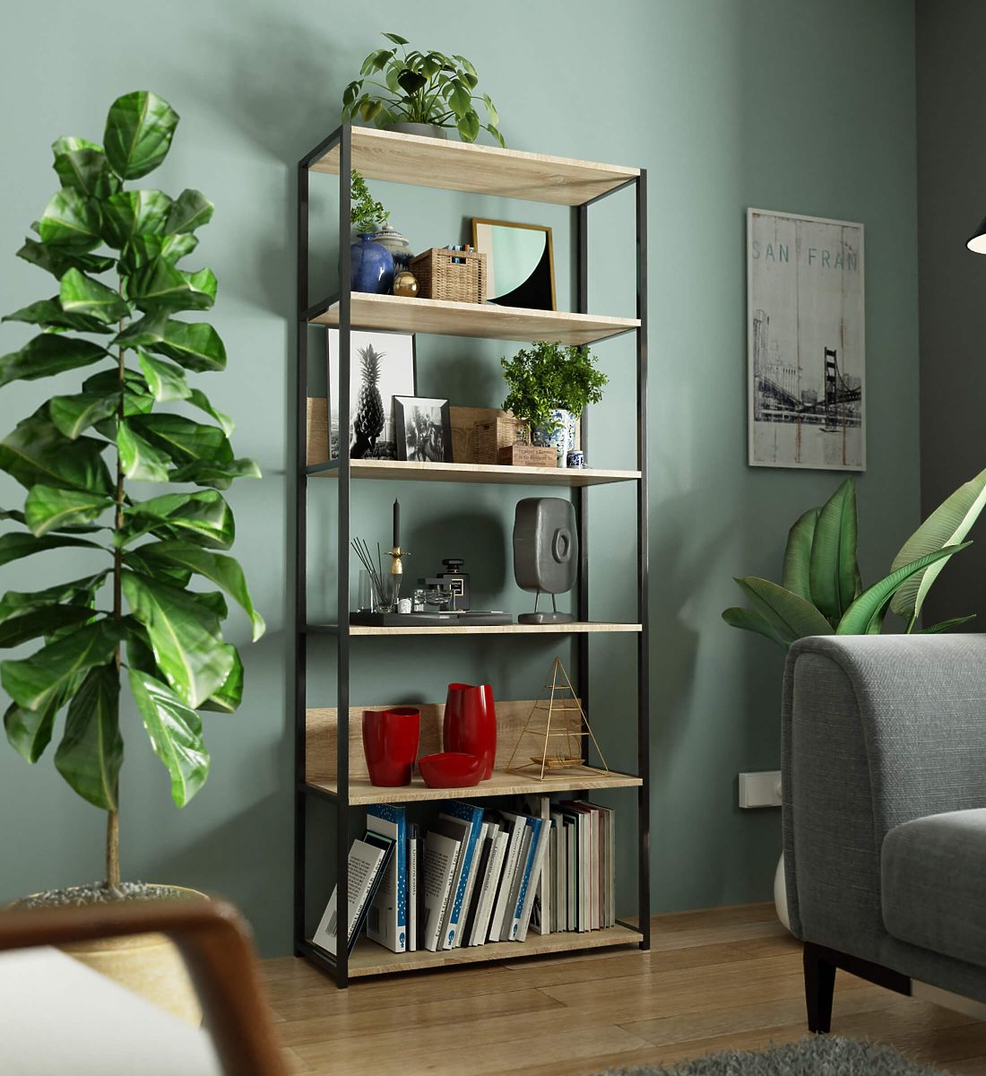 The metal loft shelf is a practical and modern piece of furniture suitable for both living rooms and offices. The shelf features a black metal frame and 6 shelves in sonoma oak color. The shelves are made from 16 mm thick laminated board, a durable and abrasion-resistant material. The edges are protected with ABS edging, ensuring the furniture maintains its appearance even with intensive daily use. The shelf is equipped with 6 shelves for displaying or keeping items handy. Overall, it presents a very stylish and modern look.