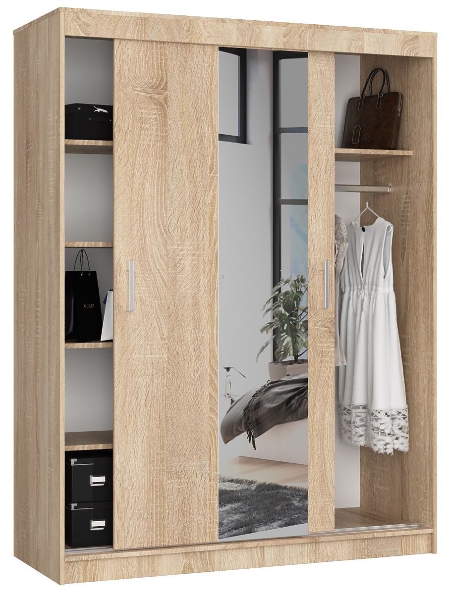 The wardrobe with a mirror placed in the central part of the furniture is made from high-quality, abrasion-resistant Kronospan laminated board. Both the furniture body and partially each of the 2 doors moving on metal guides are maintained in the warm color of Sonoma oak. The interior of the wardrobe is functionally divided into 2 parts. On the left side, there are spacious shelves (5 pieces) placed one above the other. The right part of the wardrobe consists of space for hanging clothes, with one upper shelf installed, under which a metal rod is attached.