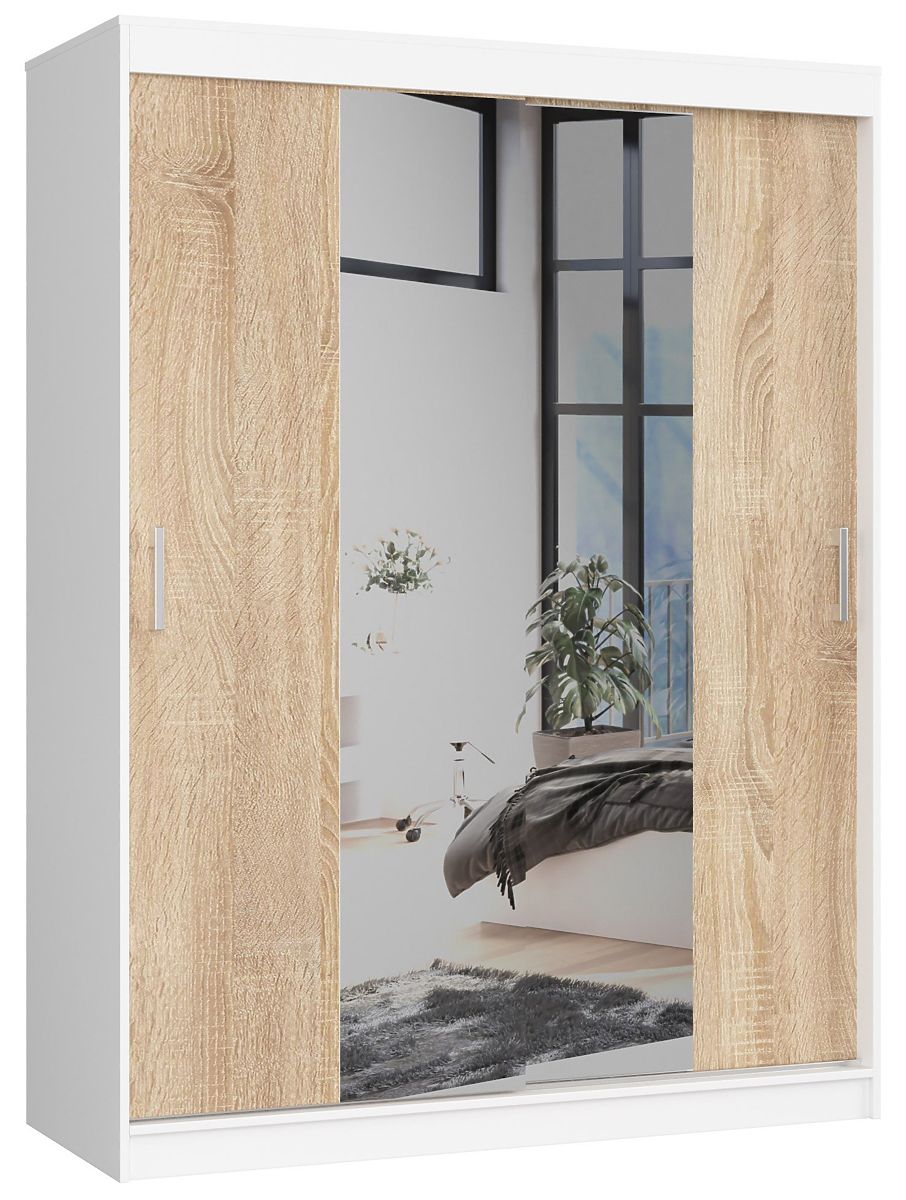 The 150 cm CLP sliding wardrobe in Sonoma shade allows us to ensure the necessary space in our bedroom or dressing room, which we can use for storing various items, not only clothes but also, for example, spare pillowcases. How we use this furniture depends on our individual needs. The wardrobe is equipped with a very practical and useful feature in the form of a mirror, which allows us to check if the chosen style is right. The furniture can also be successfully placed in the hallway, living room, or student room. The space available with this product is sufficient for two people.