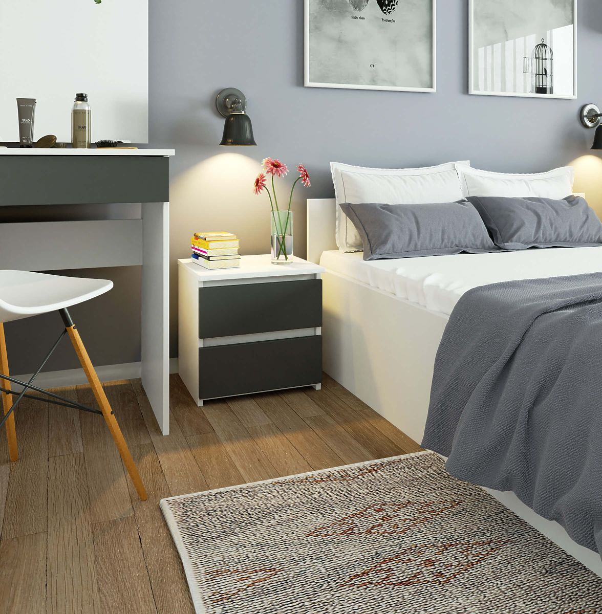 Nightstands are a popular type of furniture placed next to the bed. You can place a lamp on its top, while the drawers can hold important items that enhance the quality of rest and sleep. Our offer includes a white nightstand CL2 40 cm with drawer fronts in graphite gray. It looks elegant and modern, while also being functional. It fits perfectly in any bedroom or youth room.