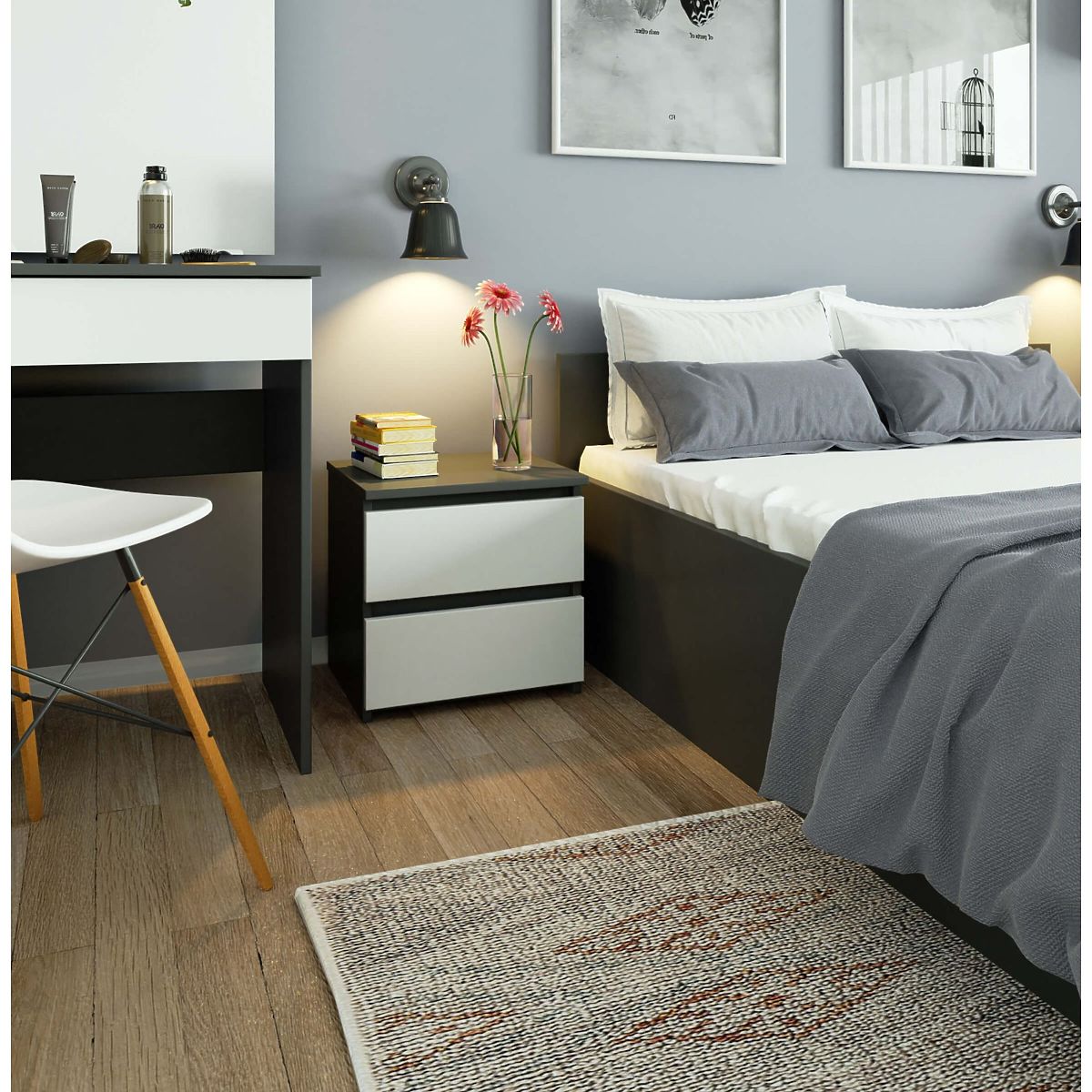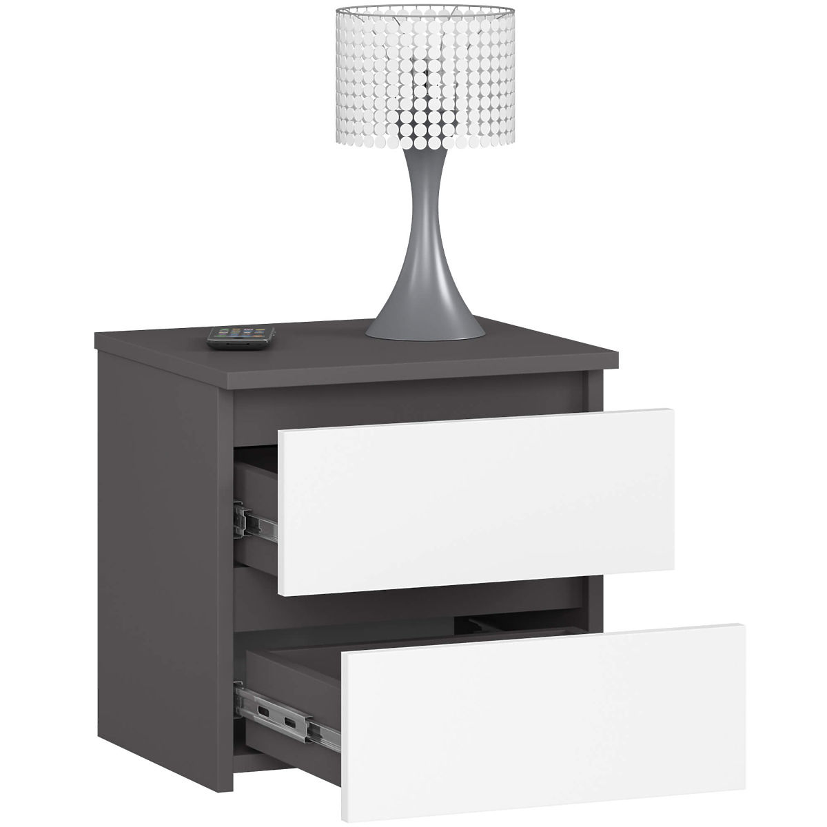 Nightstands are a popular type of furniture placed next to the bed. You can place a lamp on its top, while the drawers can hold important items that enhance rest and sleep quality. Our offer includes the CL2 40 cm nightstand in graphite gray with white fronts. It looks elegant and modern while being functional. It fits perfectly in any bedroom or youth room.