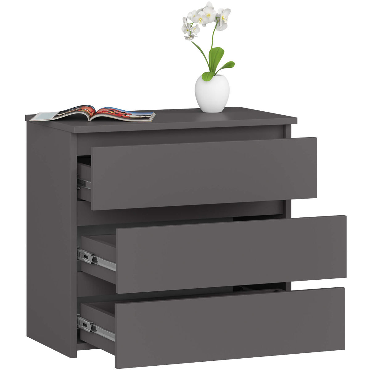 The graphite gray dresser has 3 conveniently opening drawers. It fits perfectly in the bedroom as an essential element of its equipment. The drawers can store linen, cosmetic accessories, or a set of bedding for replacement. The top is ideal for placing a bedside lamp and laying down interesting reading material. The furniture can also be placed in a children's room and a teenager's bedroom.