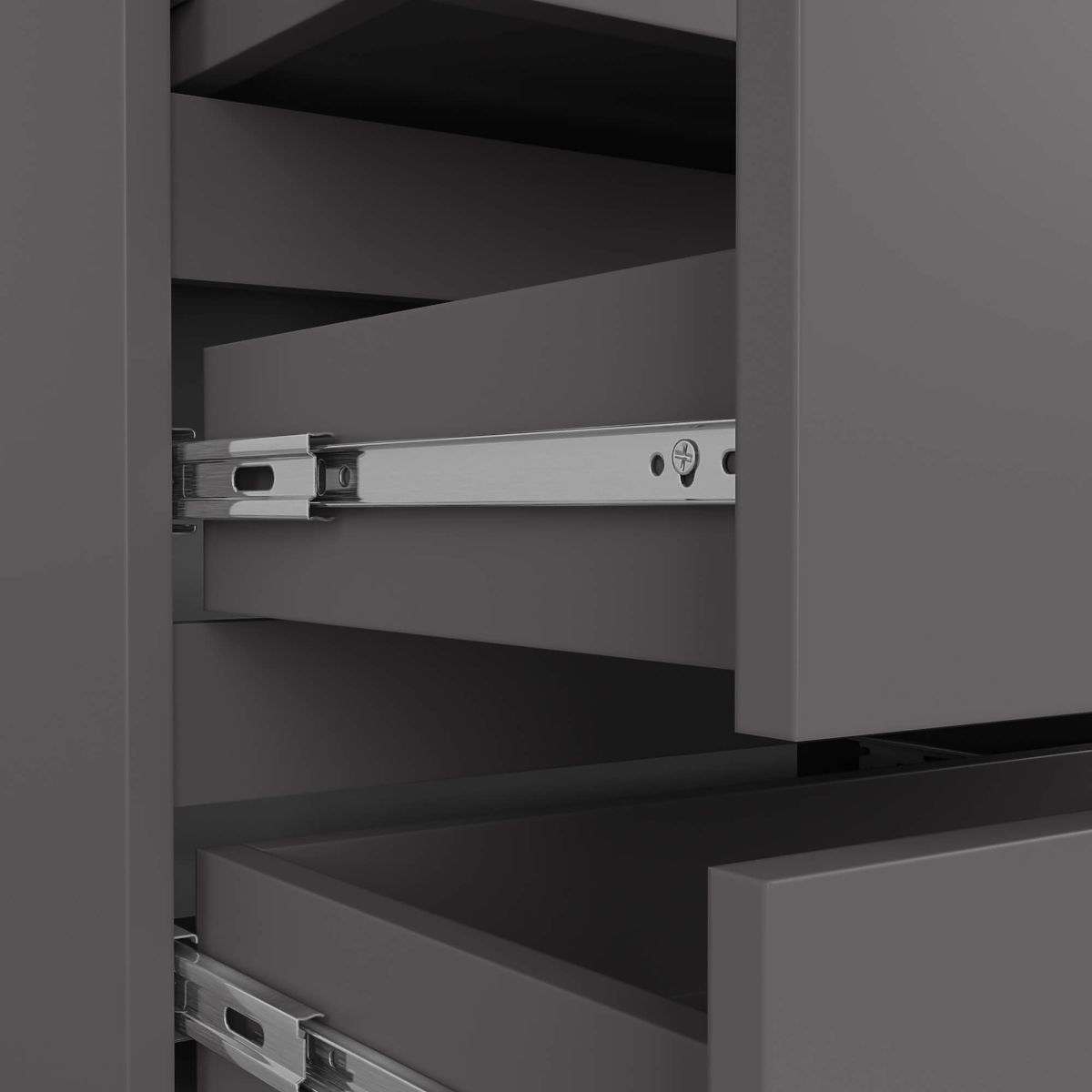 - Drawers move on metal ball bearings
