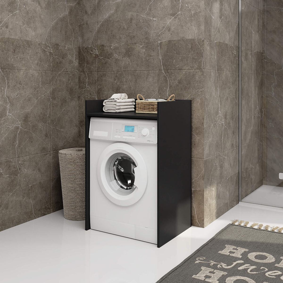 Black cabinet for utilizing space above the washing machine. .. more