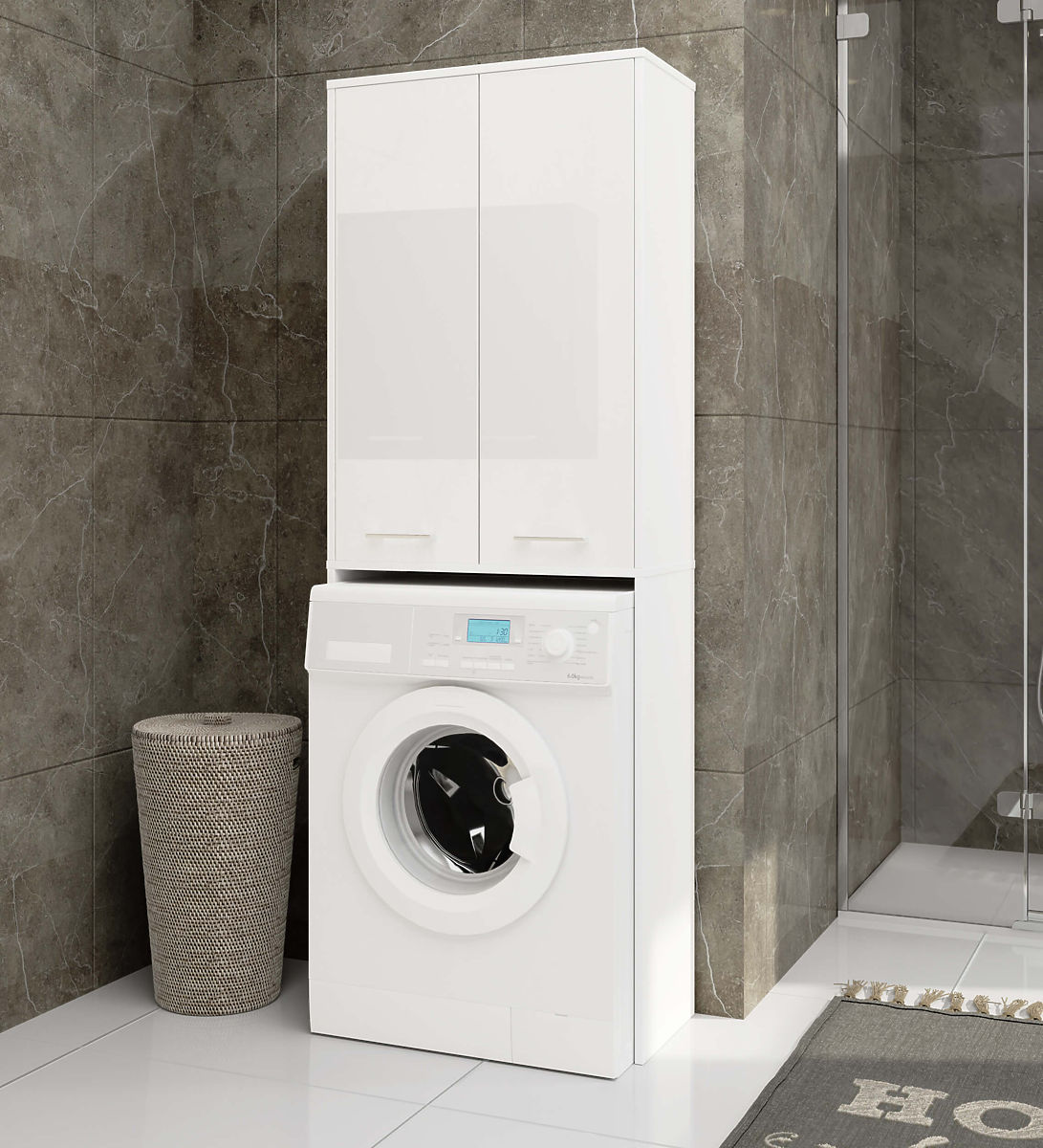 Cabinet above washing machine with 4 shelves and glossy white fronts. .. more