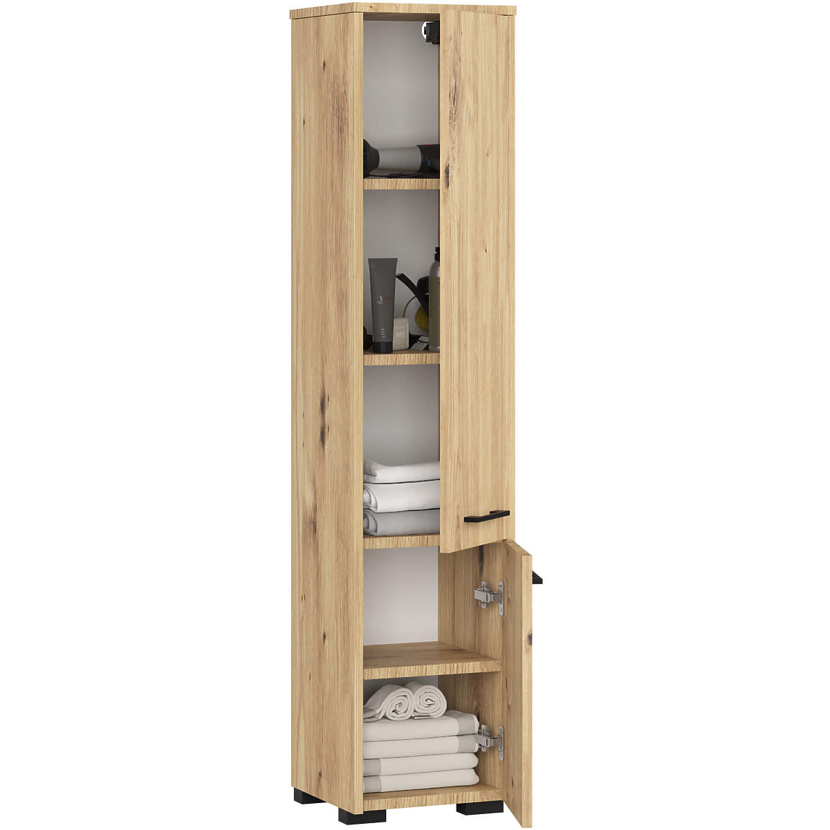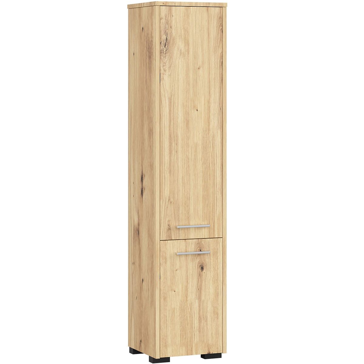 The Fin 2-door bathroom cabinet is a versatile piece of furniture that can be used in any bathroom, regardless of its size. Its elegant design and oak artisan color ensure that the cabinet perfectly matches bathrooms of any style, whether with classic or modern furnishings, and also with tiles and wall coverings in various shades. Thanks to its dimensions, the bathroom cabinet can fill often unused space in the corner of the bathroom, as well as be placed next to a sink, washing machine, or shower. The standing Fin bathroom cabinet is characterized by very careful workmanship. It has two comfortable and wide doors with ergonomic handles, providing easy access to the interior of the furniture. Deep and spacious shelves are ideal for storing towels, toiletries, cosmetics, or cleaning supplies. The bathroom cabinet is made from laminated board resistant to abrasion and water exposure. The ABS edges that finish the cabinet are durable, do not discolor, and additionally protect the cabinet from damage.