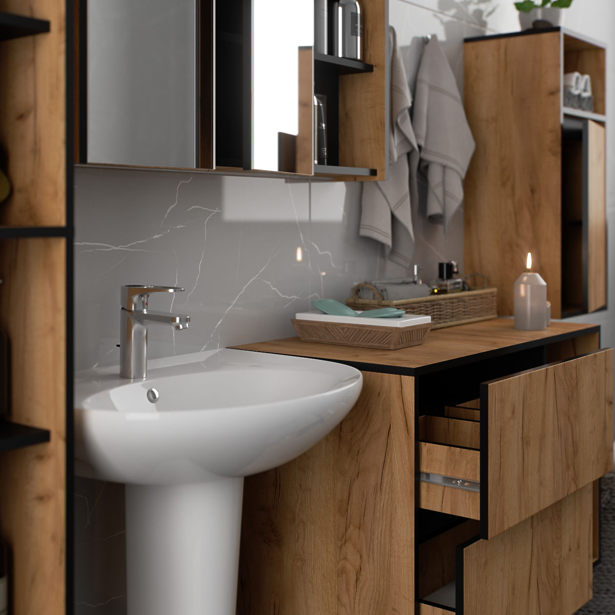 Our furniture is made of 16 mm thick laminated chipboard. This makes it very durable, strong, and moisture-resistant. However, it should not be exposed to prolonged contact with water, which can lead to swelling and deformation of the board. Cabinets with drawers are equipped with ball guides, ensuring that the drawers slide out smoothly and quietly.