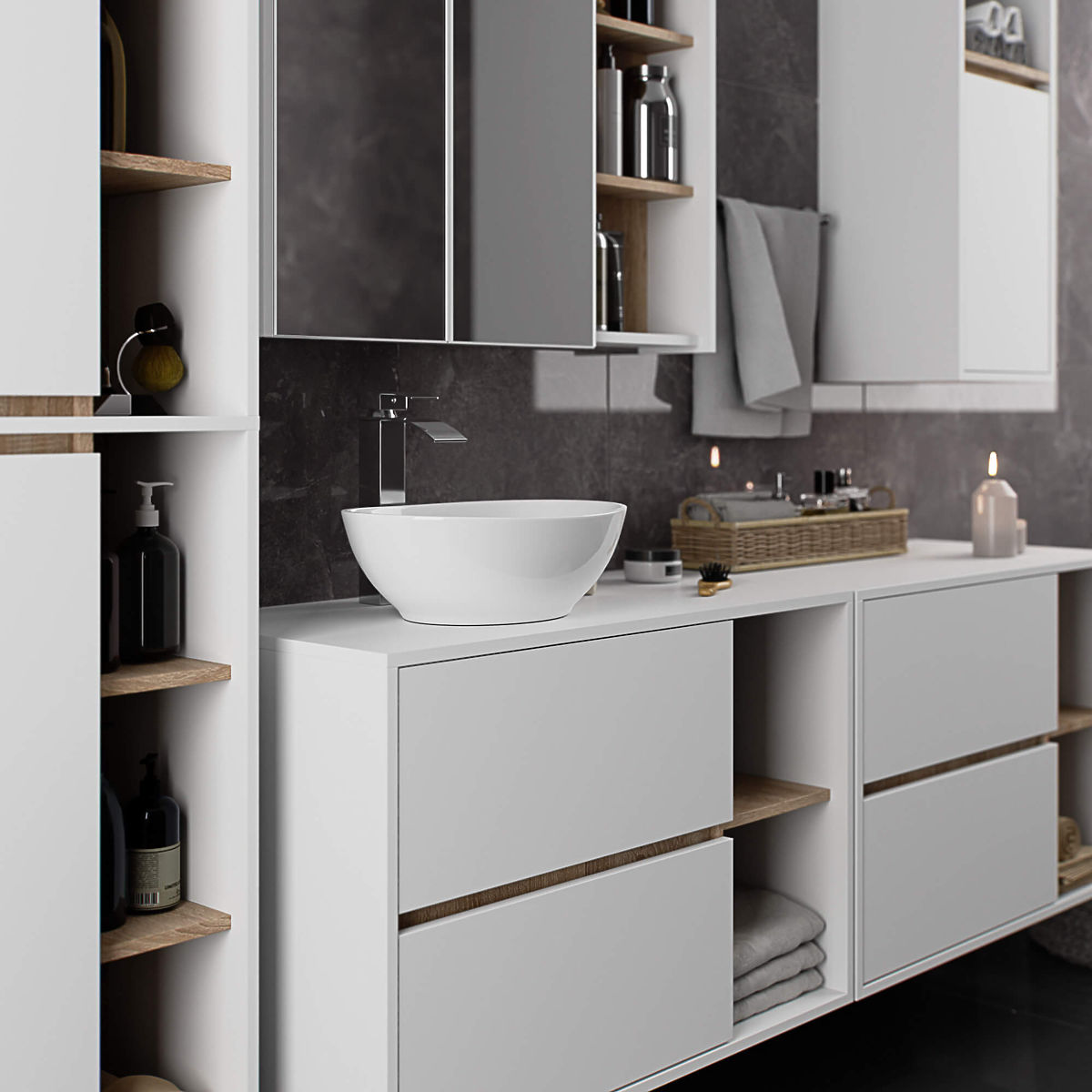 The VAMI W90 countertop sink cabinet combines modern design, a lightweight form, and high functionality. Two drawers allow for convenient and aesthetic storage of hygiene products and more. An additional advantage of the VAMI W90 countertop sink cabinet is the two open shelves, which give it an attractive look in line with the latest trends. The dimensions of this model are: width 90 cm, height 60 cm, and depth 45.5 cm. The furniture is designed for wall mounting. It has specially shaped drawers to allow for the installation of a siphon and plumbing components.