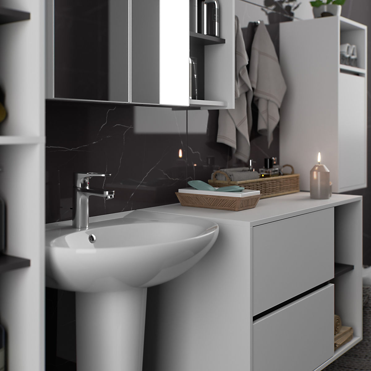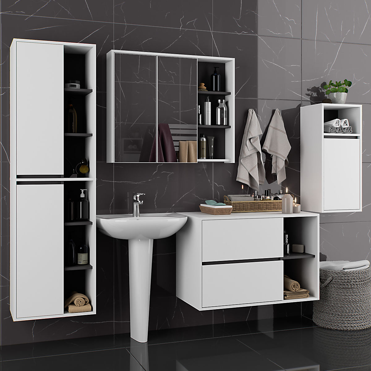 The cabinets are independent, allowing them to be arranged in any configuration and spacing according to personal needs. The price applies only to the bathroom cabinets, decorative elements are not included in the set.
