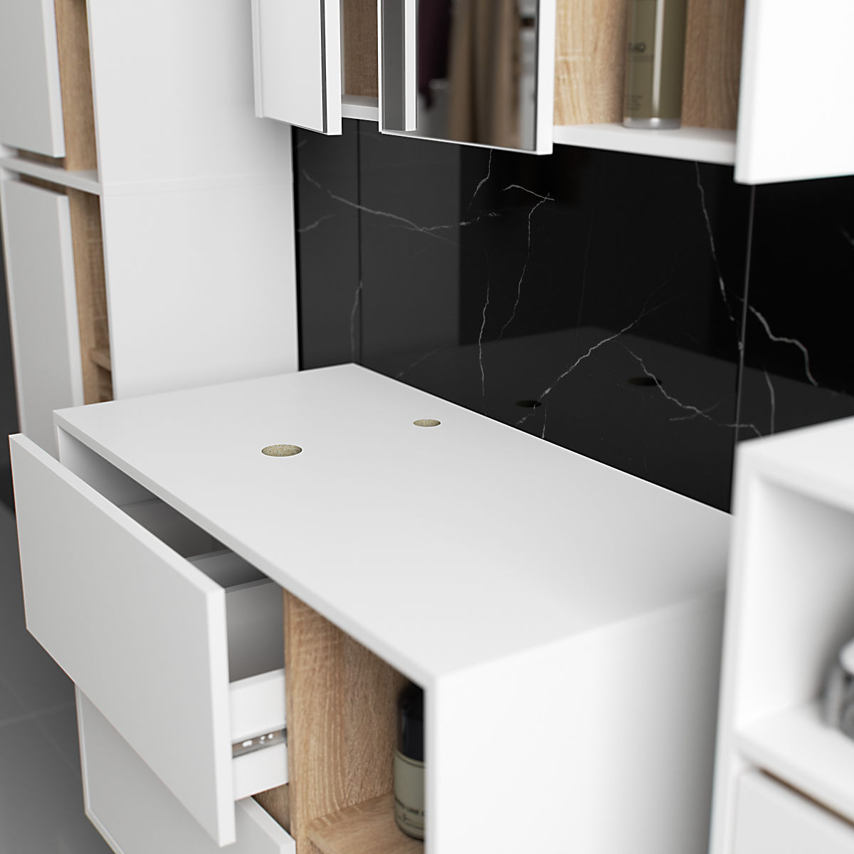 SET OF HANGING BATHROOM FURNITURE WITH OPENINGS Made from 16 mm abrasion-resistant laminated board.