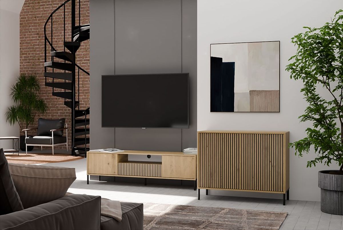 COLOR: ARTISAN OAKELEGANCE AND PRACTICALITY IN ONEThe KAMARO 2D SLIM sideboard combines aesthetics and functionality, making it perfect for the living room, guest room, bedroom, or study. The grooved front panel of the doors (reminiscent of slats) gives the furniture a modern and original look that fits perfectly into contemporary interiors.