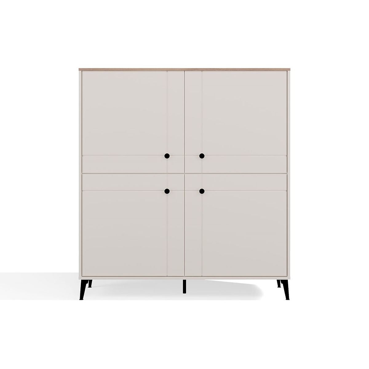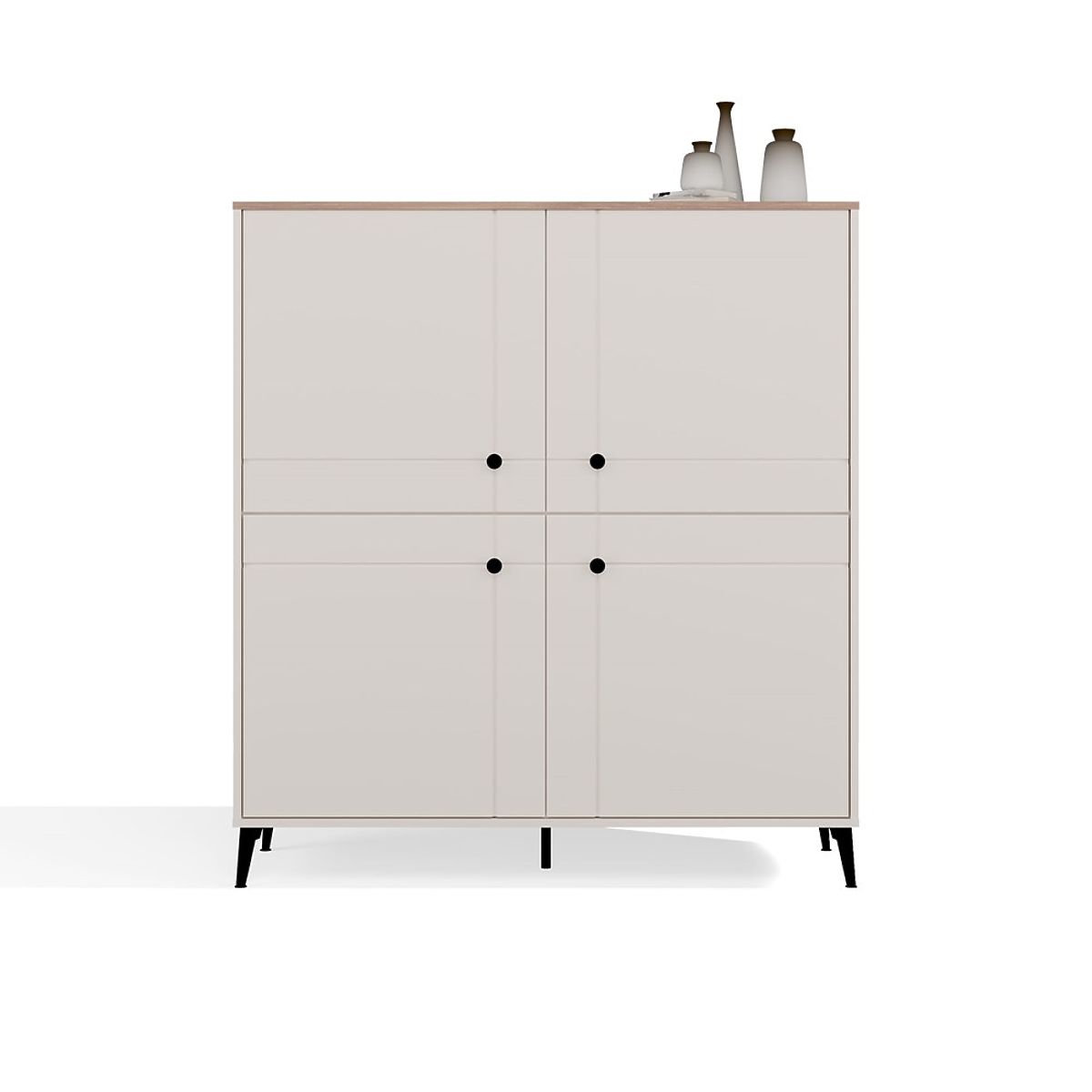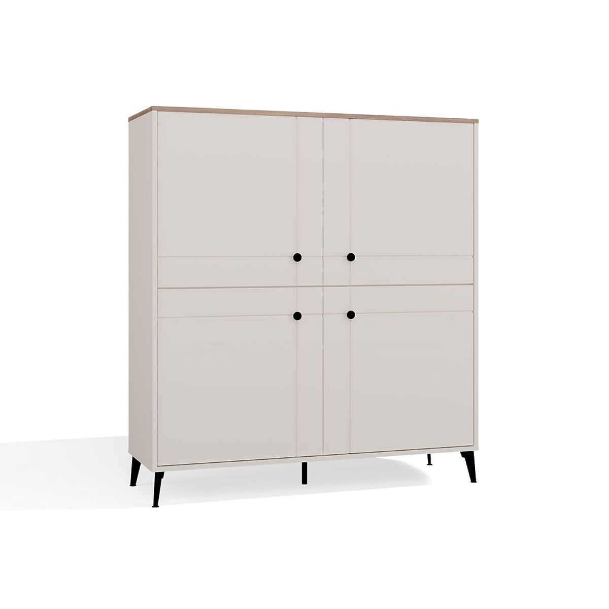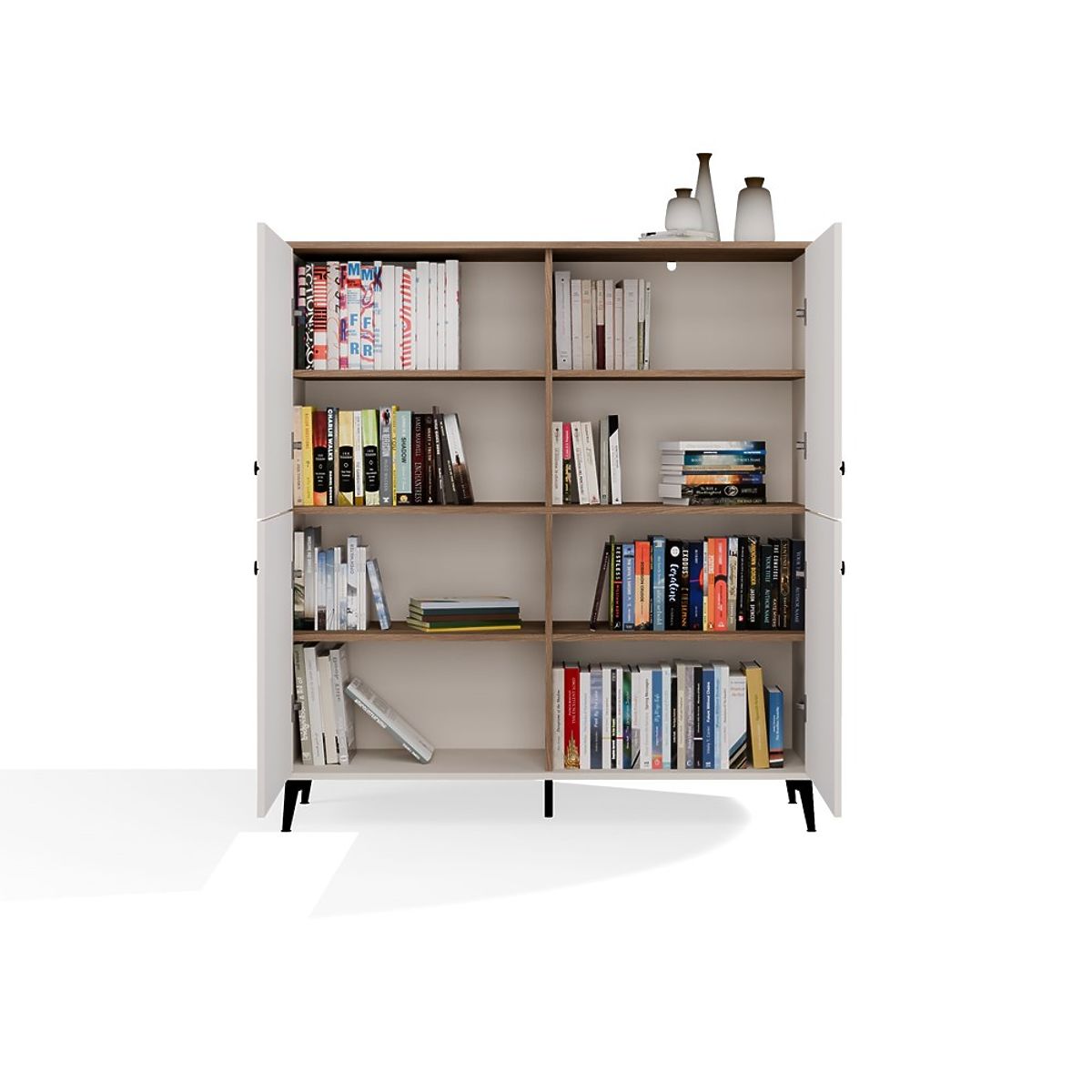 The model features four front doors with soft-closing mechanisms, concealing up to eight practical shelves—ideal for storing books, documents, textiles, or everyday accessories.