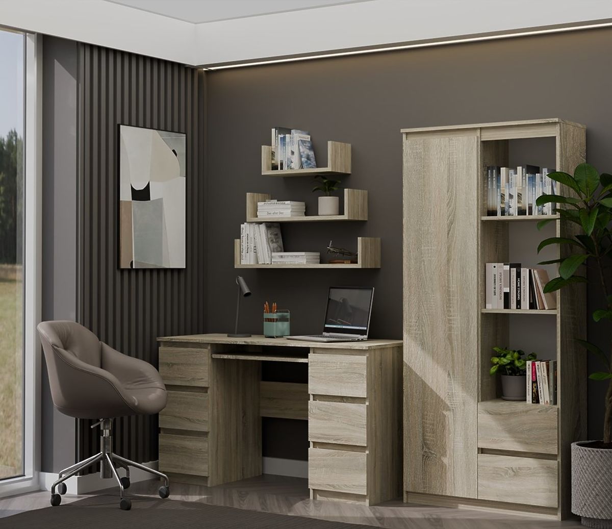 The furniture is made of high-quality laminated board resistant to scratches and moisture, along with reinforced ABS edges.